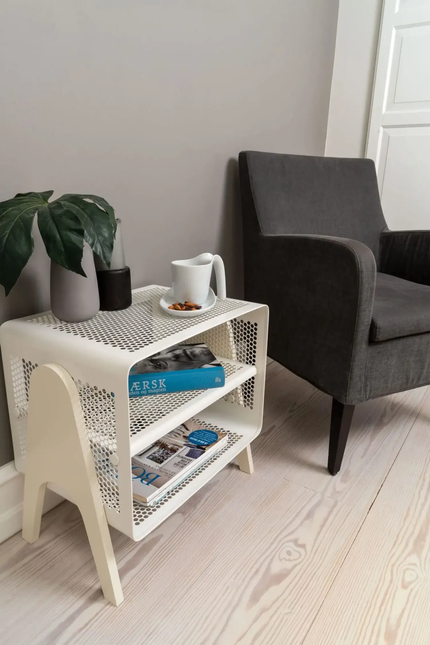 Tica Copenhagens lille gulvreol er en multifunktionel reol/møbel i perforeret metal, som er designet til sko, men den kan bruges til en lang række andre ting og sager. Hylden kan let flyttes, så du kan optimere pladsen på reolen.