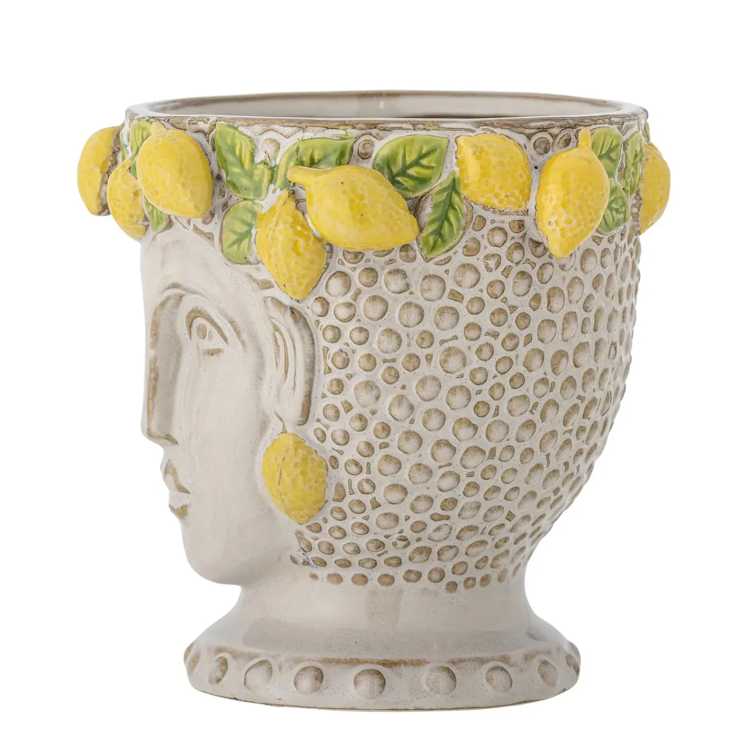 Creative Collection præsenterer en charmerende tilføjelse til dit hjem med Limone urtepotteskjuleren. Denne unikke potte i gul stentøj er formet som et kvindeansigt med en krone af citroner og blade, der tilfører et strejf af italiensk inspiration til din indretning. Delvist hånddekoreret inviterer denne urtepotteskjuler naturen indendørs og lader tankerne vandre til solrige italienske haver. Den kunstneriske udformning gør den til et iøjnefaldende element i enhver plantesamling.
