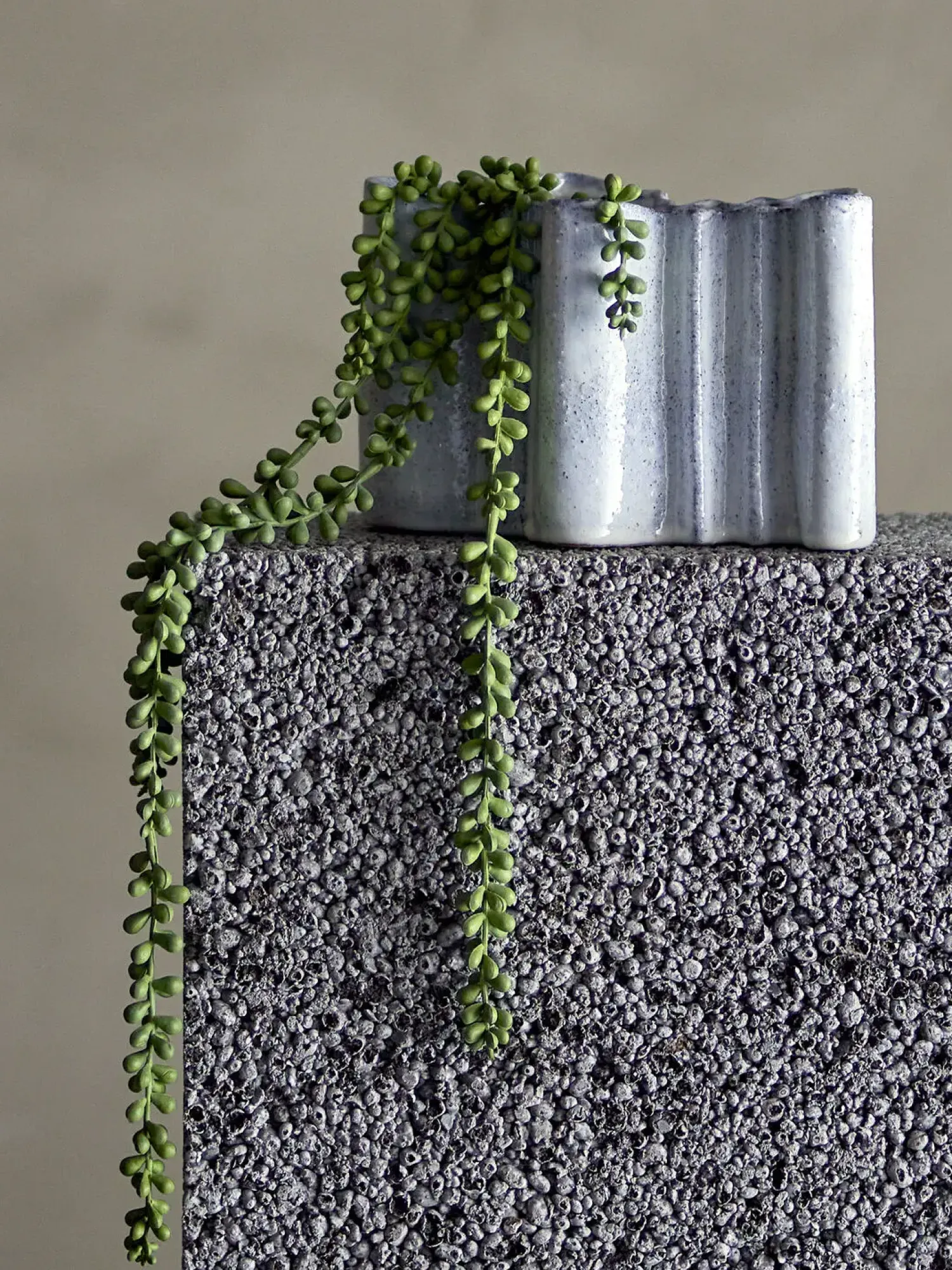 Den bølgende form skaber interessante skygger og dybde i dit rum. Stentøjets robuste egenskaber sikrer, at vasen forbliver smuk gennem daglig brug, mens den matte overflade giver et sofistikeret udtryk.