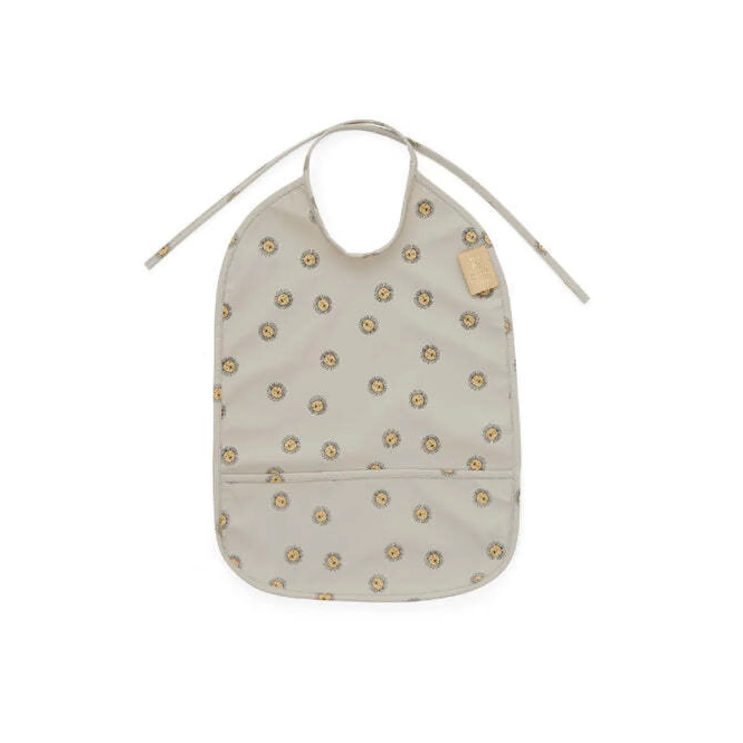 Hagesmækken er lavet i polyester og har et fint grafisk mønster med løver. En lille lomme i bunden af hagesmækken sørger for at gribe den overskydende mad, så den ikke fortsætter ned på barnets tøj. Den bløde hagesmæk lukkes med et bindebånd i nakken. Hagesmækken er lavet af 100% polyurethan.30° skånsom maskinvask anbefales.