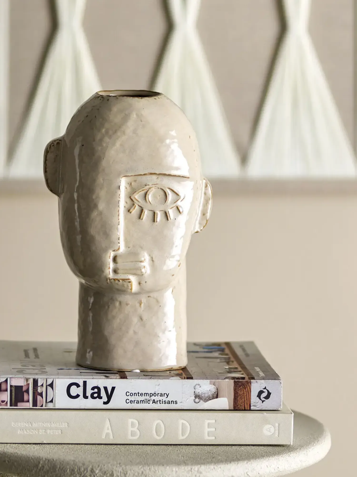 Vasens størrelse gør den velegnet til både større og mindre blomsterbuketter. Det karakteristiske ansigtsdesign tilfører et kunstnerisk element til din indretning, mens den neutrale farve skaber ro i udtrykket.