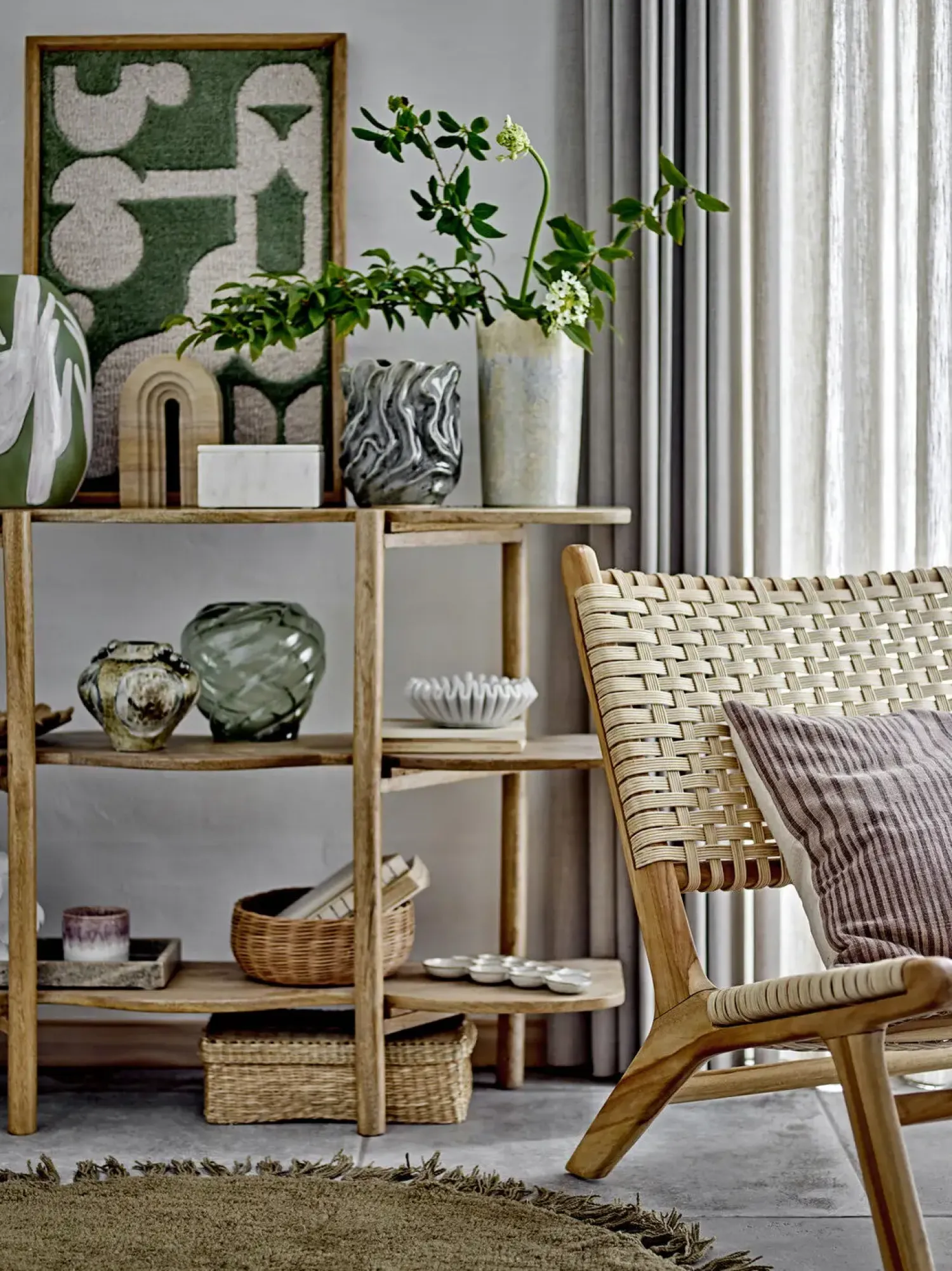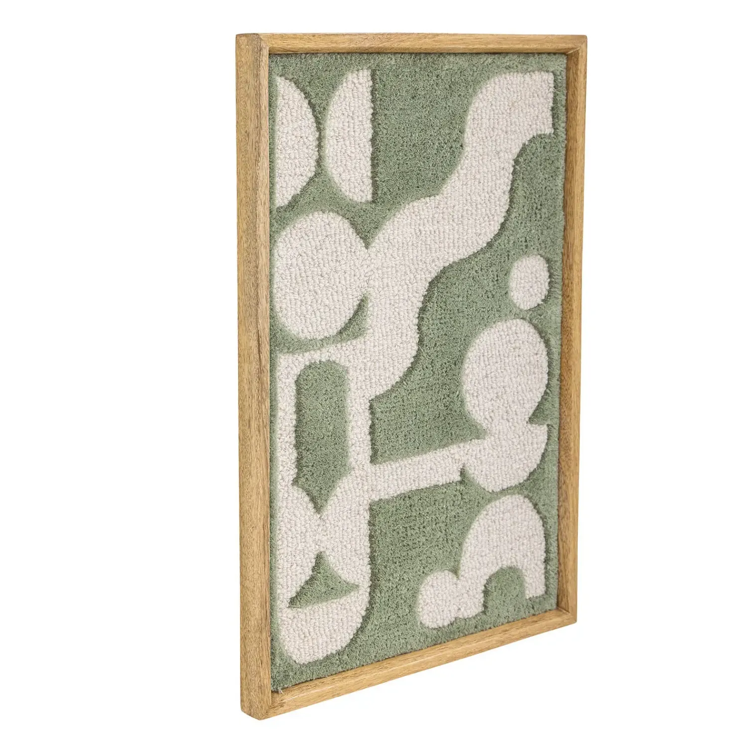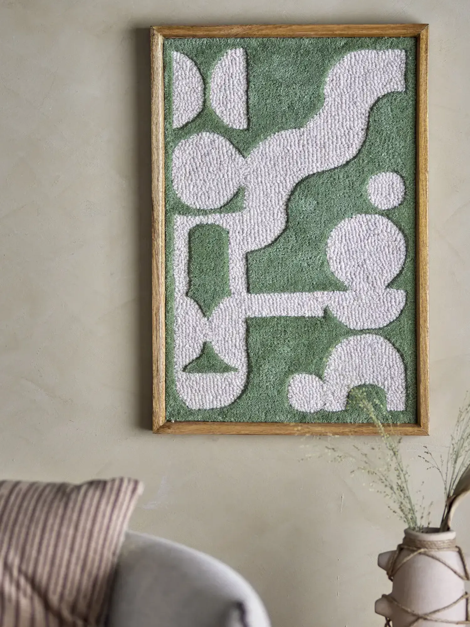Longton Wall Decor fra Bloomingville er harmoniske, organiske former på en blød tuftet overflade i en smuk nuance af grønne og lyse farver. Det grafiske mønster er smukt indrammet i en træramme, hvilket giver det et naturligt og tidløst udtryk. Vægdekorationen kan hænges både lodret og vandret og vil tilføje varme og karakter til enhver væg.