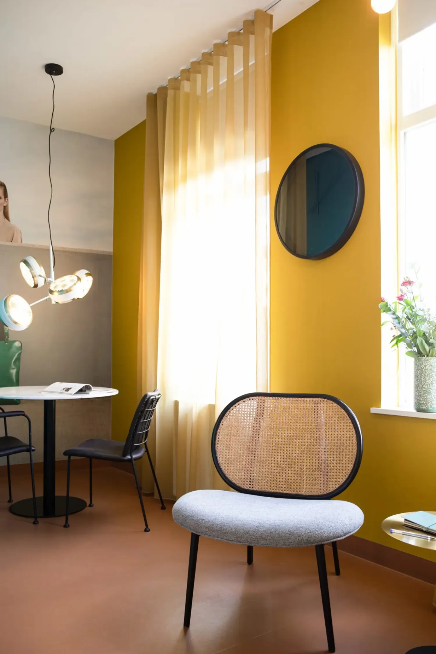 100% polyester seat and rattan back in solid beechwood lacquered frame
