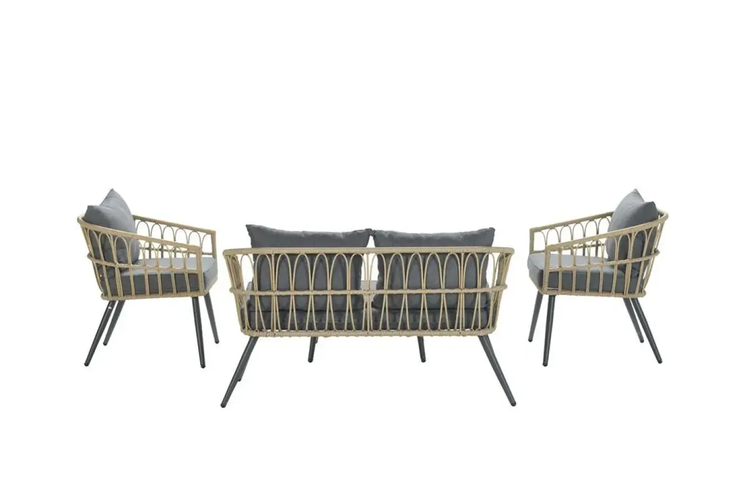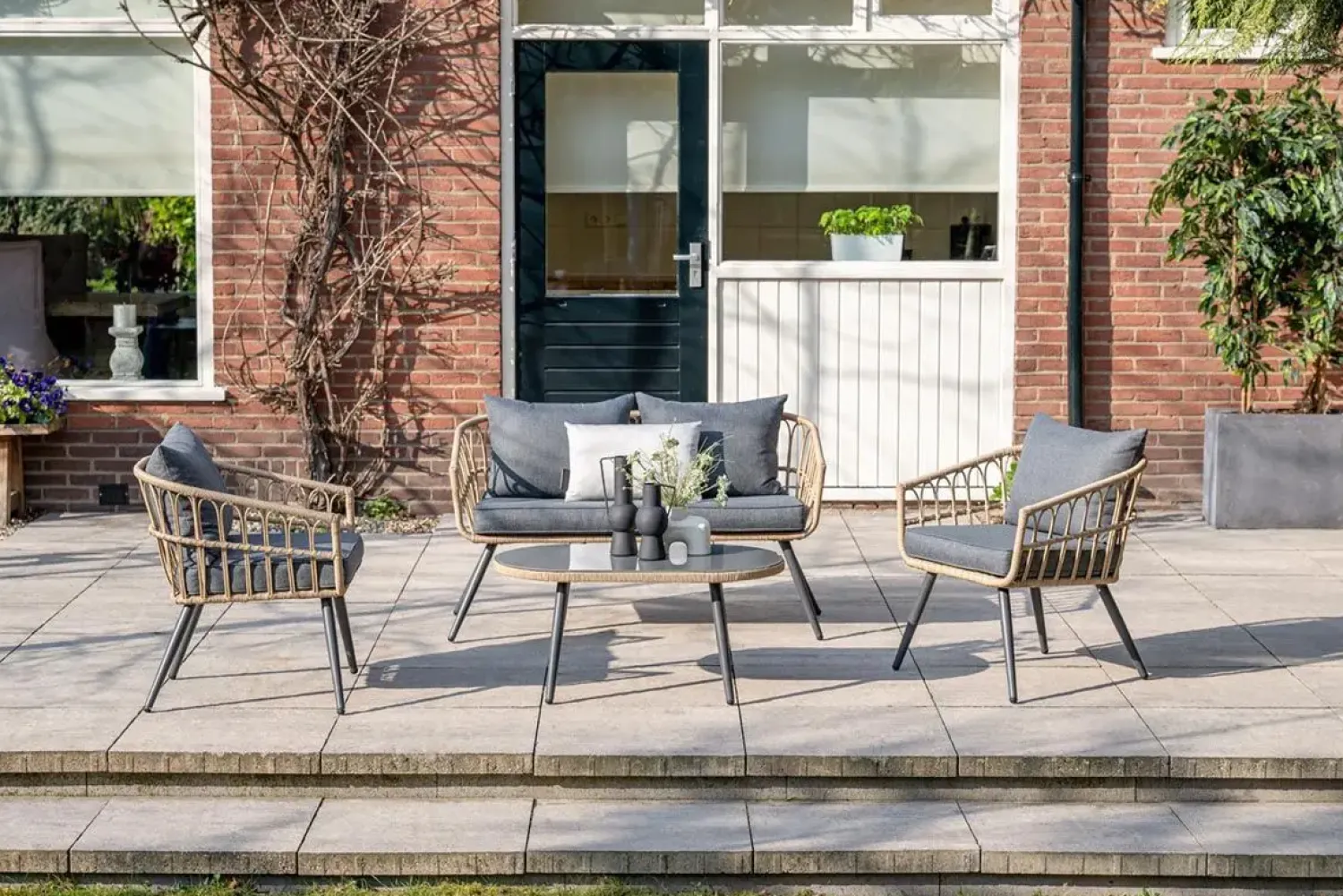Dette 4-dels loungesæt giver en komplet løsning til terrassen med to stole, en tosæders sofa og et sofabord. Fletmønsteret i sort/natur skaber en behagelig atmosfære i dit uderum.