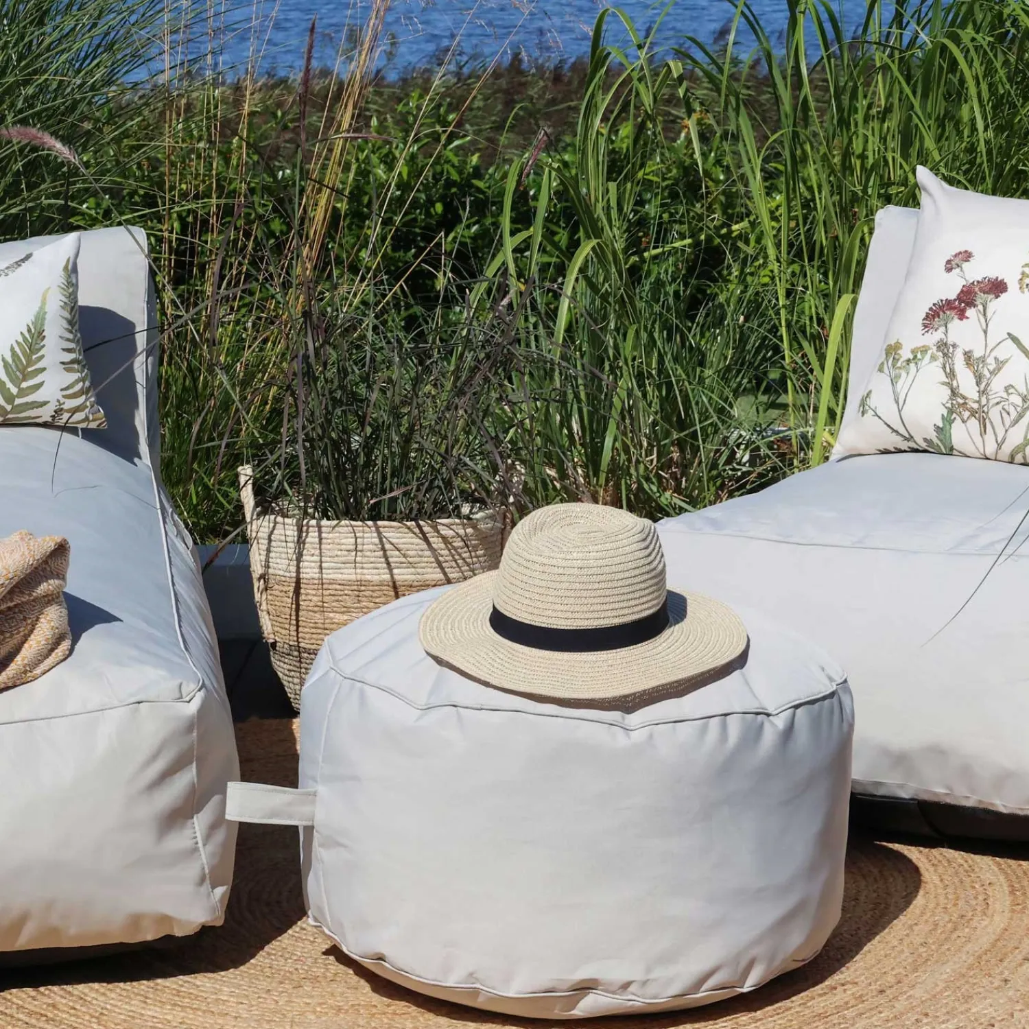 Denne loungepuf fra Chic Antique er designet til både indendørs og udendørs brug. Den er vandtæt og har et håndtag, der gør den nem at flytte rundt.
