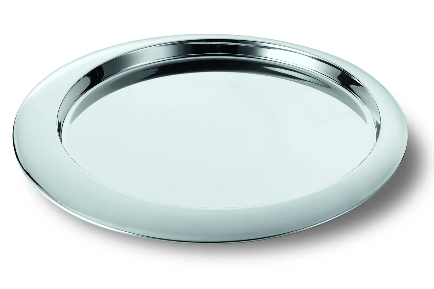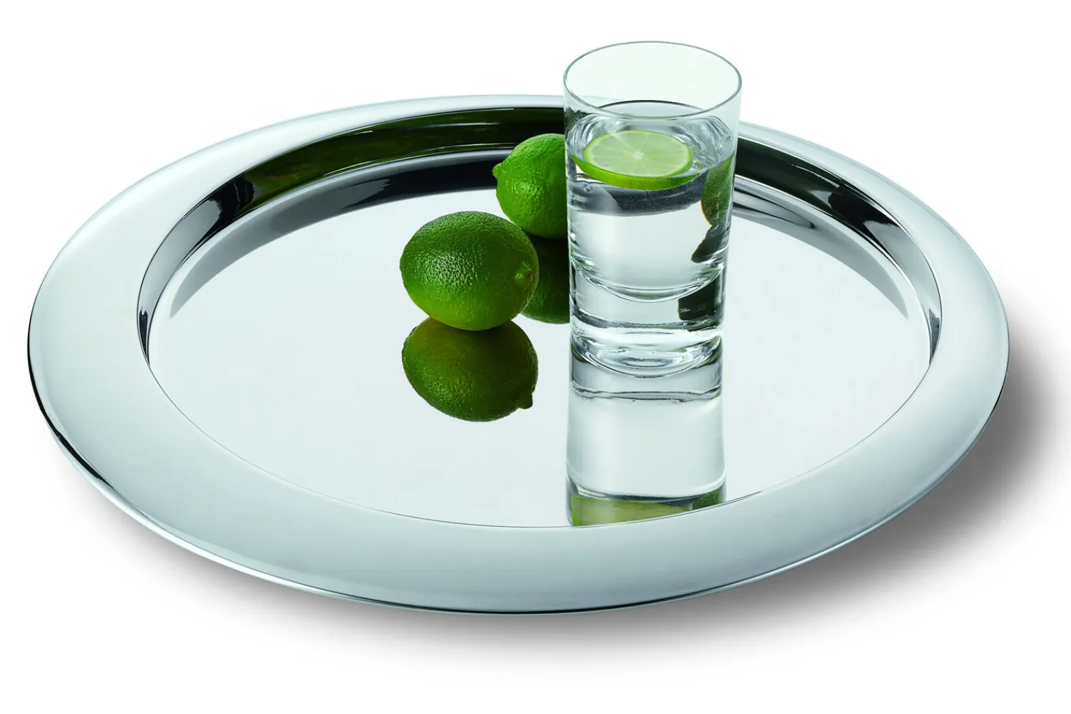 Luna-tray kendetegnes ved sin spejlpolerede overflade, der skaber et interessant spil af lys og refleksioner. Den brede kant omkring det centrale område giver bakken et distinkt udseende og forbedrer dens funktionalitet ved at gøre den lettere at bære og håndtere. Bakkens runde form og reflekterende overflade gør den til et bemærkelsesværdigt element på ethvert bord.