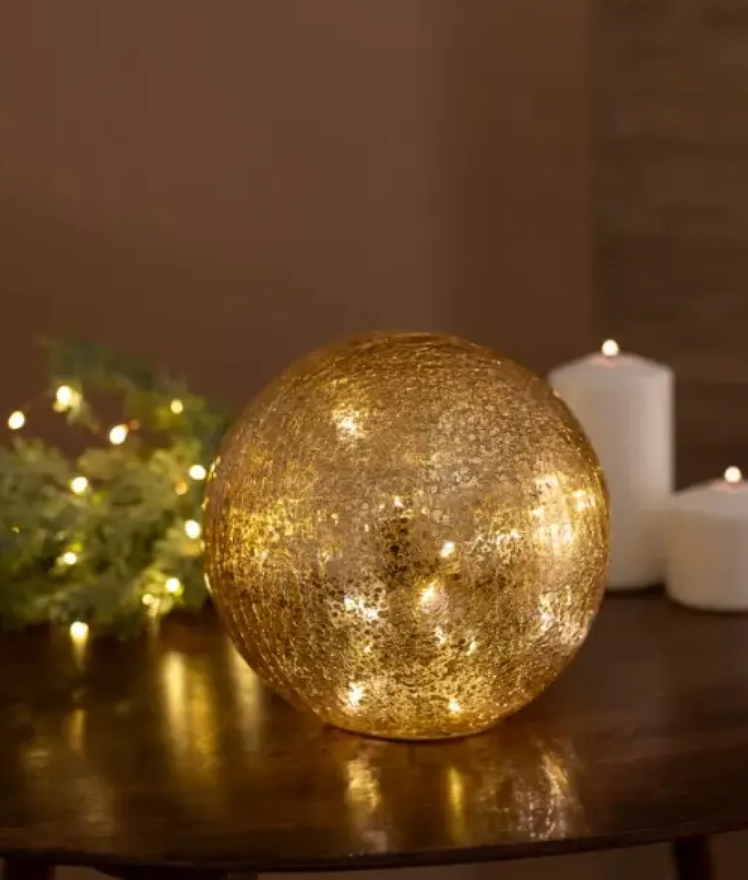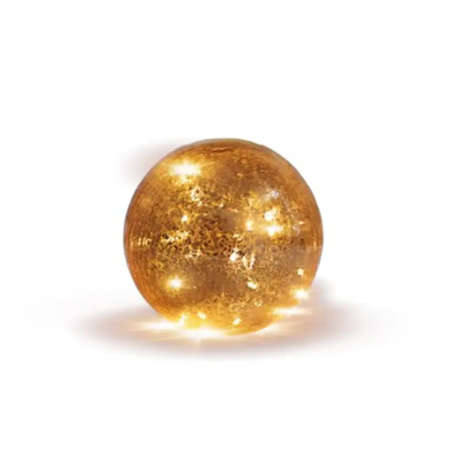 Denne lysende glaskugle fra New Garden skaber belysning i din indretning. Glasoverfladen med gylden finish kaster lysmønstre og tilfører et dekorativt element til rummet. Kuglen måler 20 cm i diameter og passer godt til vindueskarme eller andre flader.