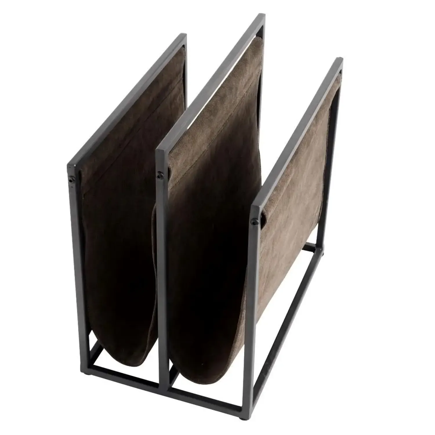 Muubs magasinholder i sort/grå jern og ruskind er en løsning til at organisere dine læsematerialer. Dette design kombinerer funktionalitet med et distinkt udseende, hvilket gør den til et interessant tilbehør i moderne indretninger.