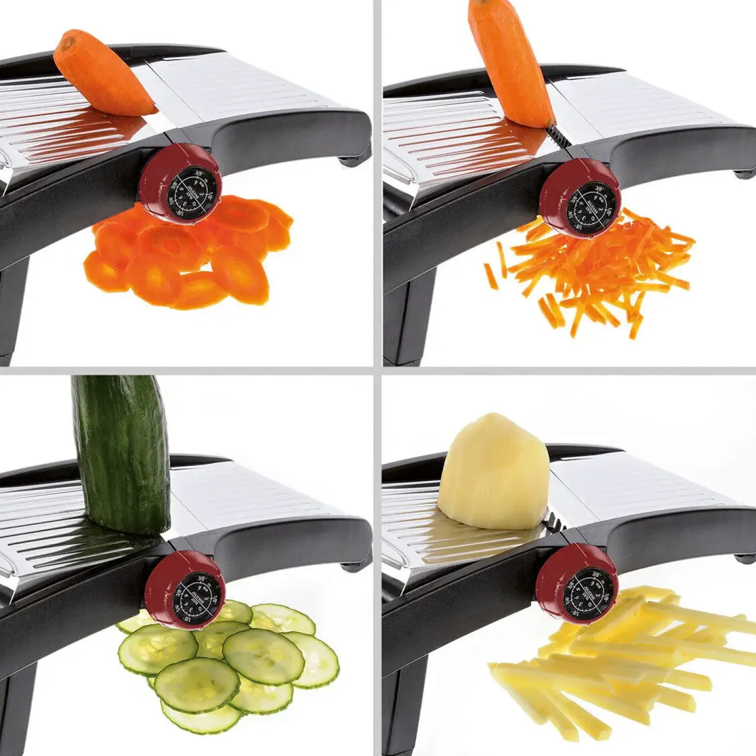 Westmark – Mandolinjern – Vario er udstyret med justerbare skæreblade, der giver kontrol over tykkelsen og formen på dine snit. Det indbyggede drejelige skær muliggør justering af skæredybden, så du kan skabe forskellige tykkelser fra tynde skiver til tykkere stave. Produktet inkluderer en håndbeskytter med håndtag, designet til at holde dine fingre på afstand af de skarpe blade under brug.