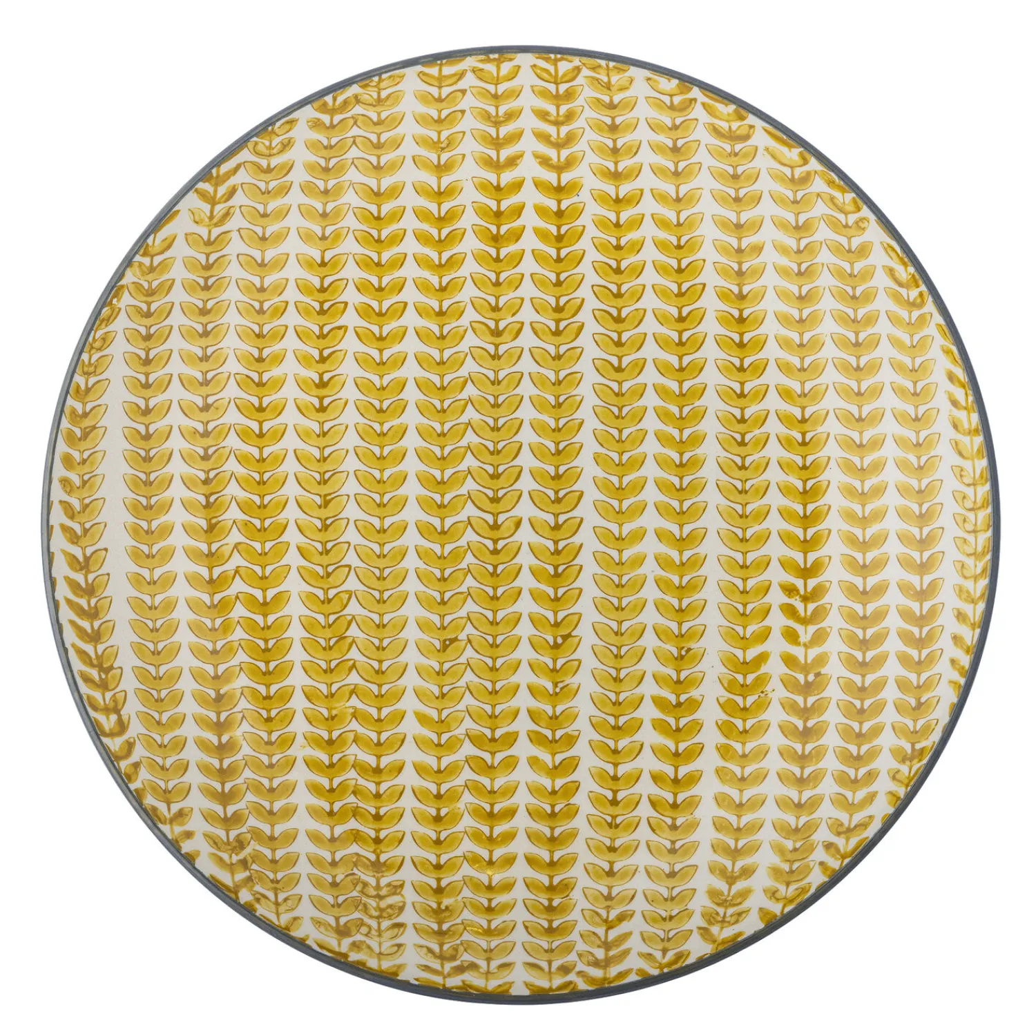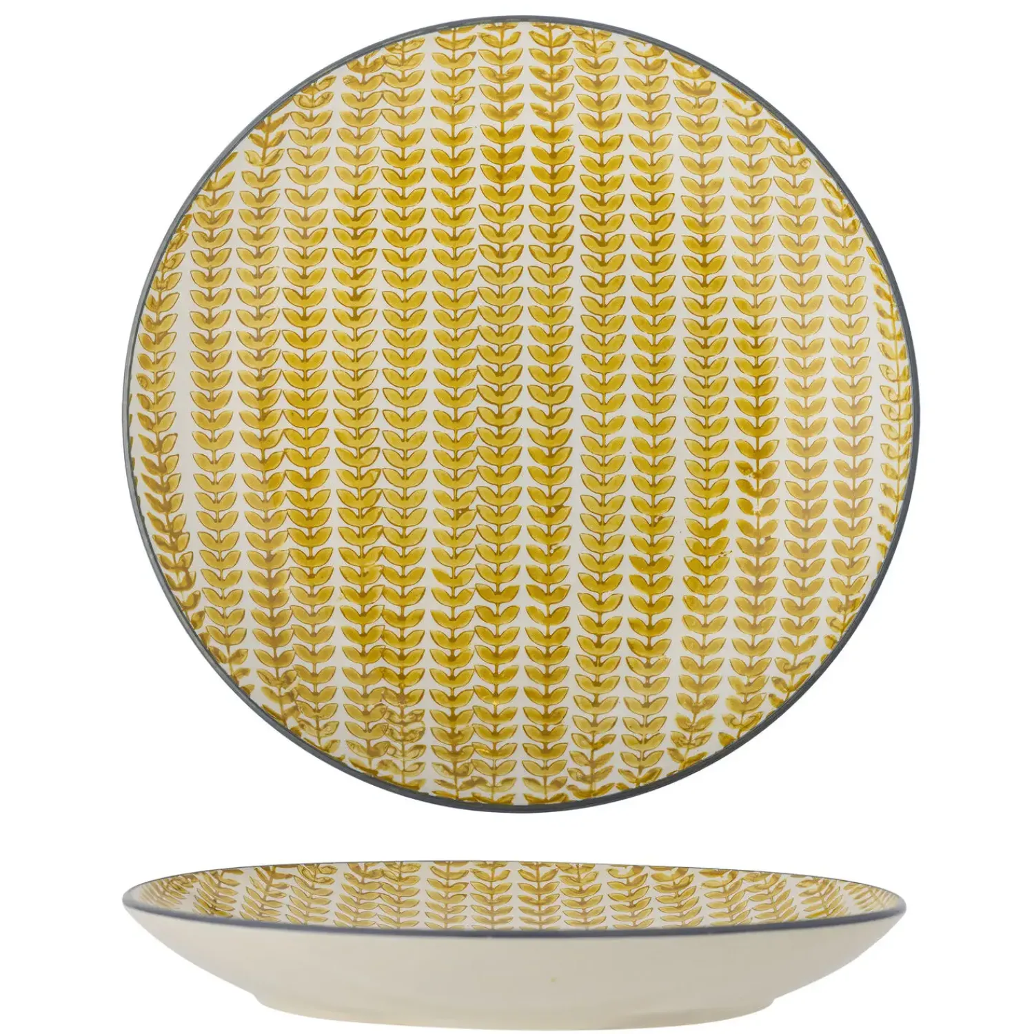 Denne stentøjstallerken på 25,5 cm i diameter kombinerer hverdagens praktiske behov med et dekorativt bladmønster. Den gule dekoration med håndmalede detaljer giver hver tallerken sit eget særpræg, da farveintensiteten kan variere.