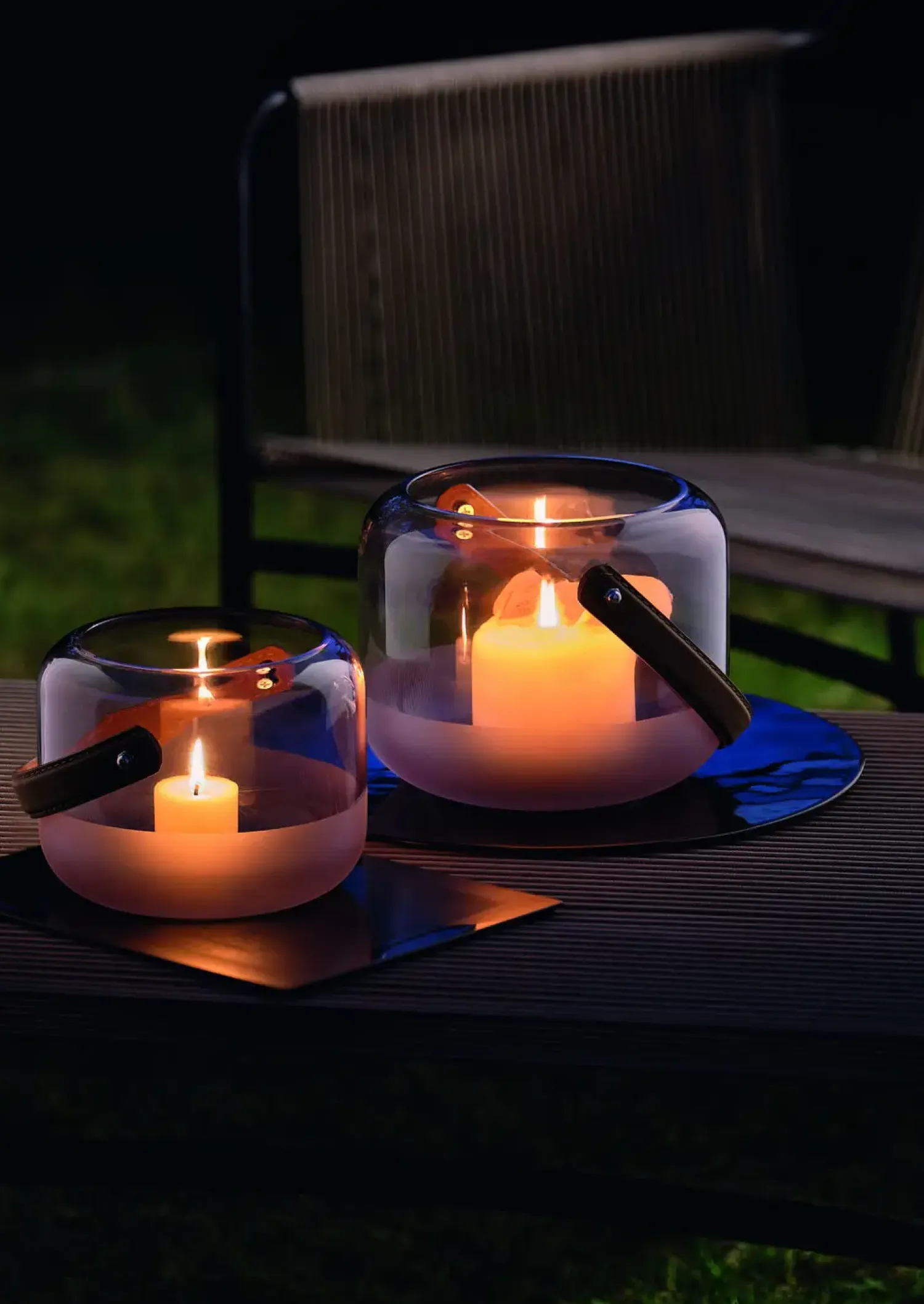 Lysholderen er fremstillet af omhyggeligt mundblæst glas, hvilket giver hvert stykke en individuel karakter og understreger det høje niveau af håndværk. Læderremshåndtaget tilføjer en kontrast i materialevalget. Kombinationen af glas og læder skaber en interessant visuel effekt og giver produktet en luksuriøs følelse.