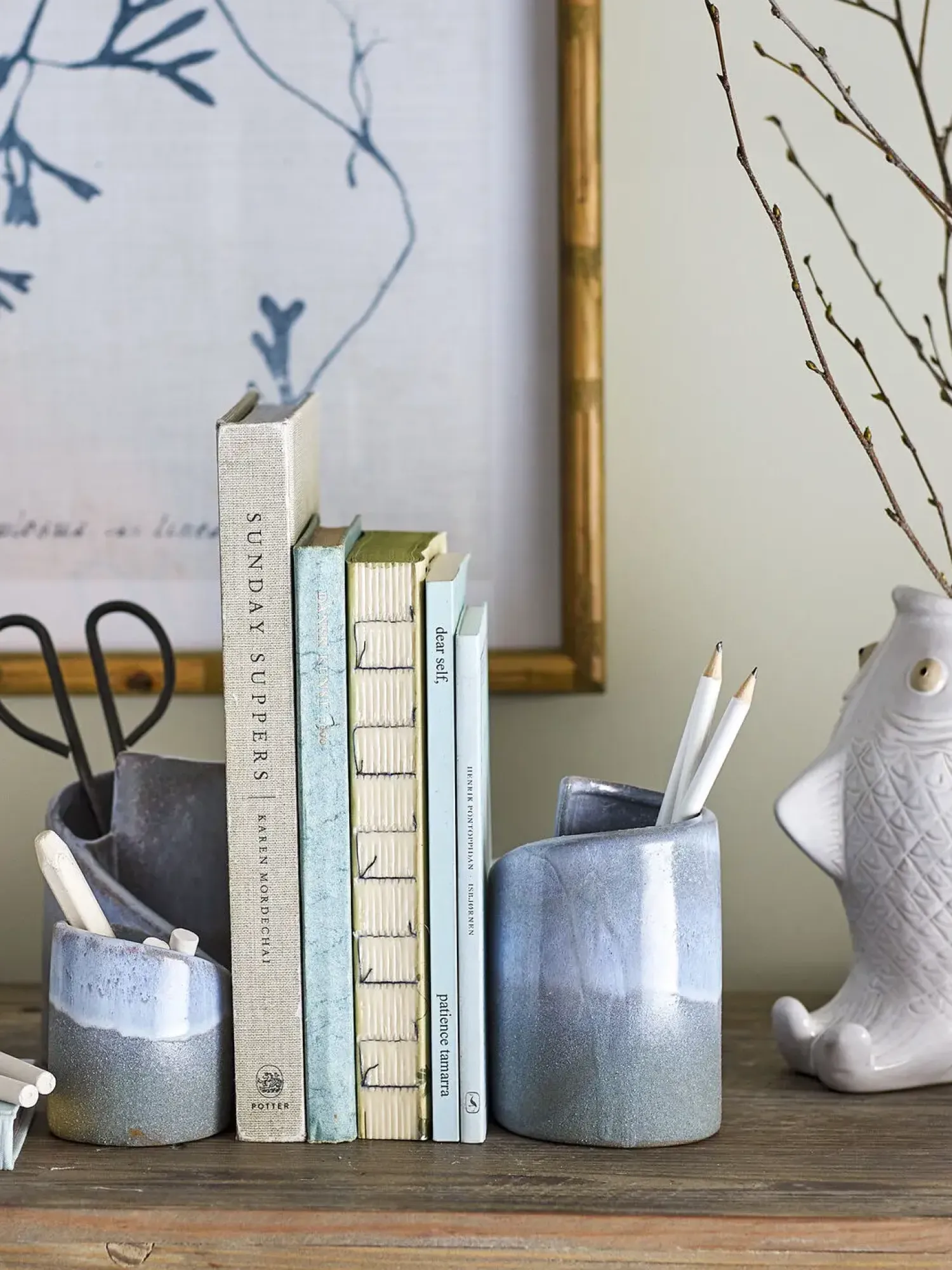 Meliad Bookend fra Creative Collection har et skulpturelt design lavet af stentøj med en blå reaktiv glasur. Opgrader din bogreol eller reol med både en praktisk og dekorativ løsning. På grund af den reaktive glasur kan der forekomme farvevariationer, hvilket gør hver bogstøtte unik.
