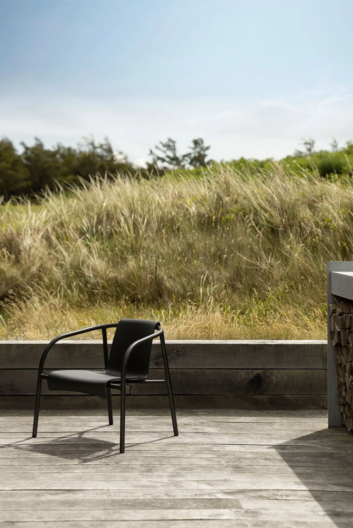 Stolen produceres i Danmark og fås i tre monokrome farver. Du kan vælge den variant, der passer til din stil. Materialet af genanvendt plastik gør stolen egnet til udendørs brug i forskellige vejrforhold.