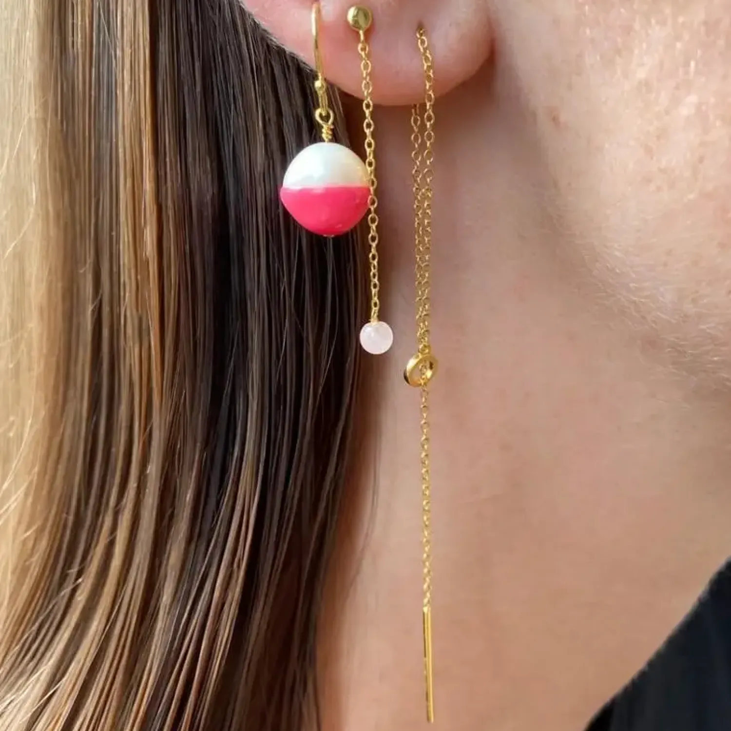 Den smukke Natural Stone Chain ørering er en helt klassisk ørekæde. Stenene stammer fra naturen og er tusindvis af år gamle. Den lyserøde her er rose quartz, der er kendt som kærlighedsstenen.