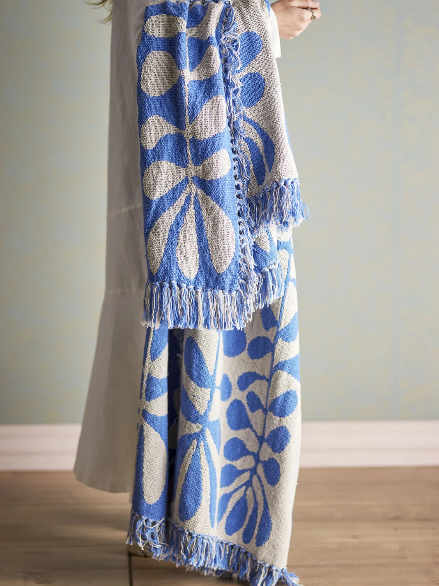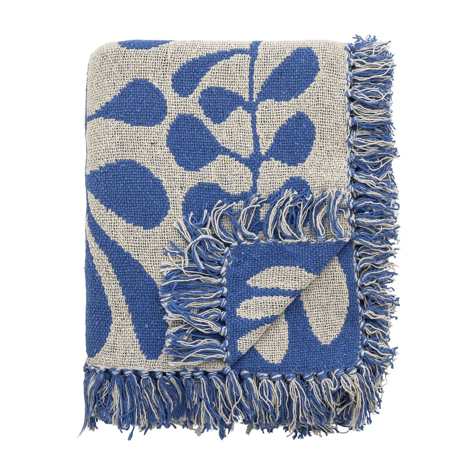 Denne dobbeltvævede plaid fra Bloomingville har et blomster- og bladmønster i blå nuancer på en lys baggrund. Plaiden har frynser på alle fire sider og er fremstillet af genanvendt bomuld.