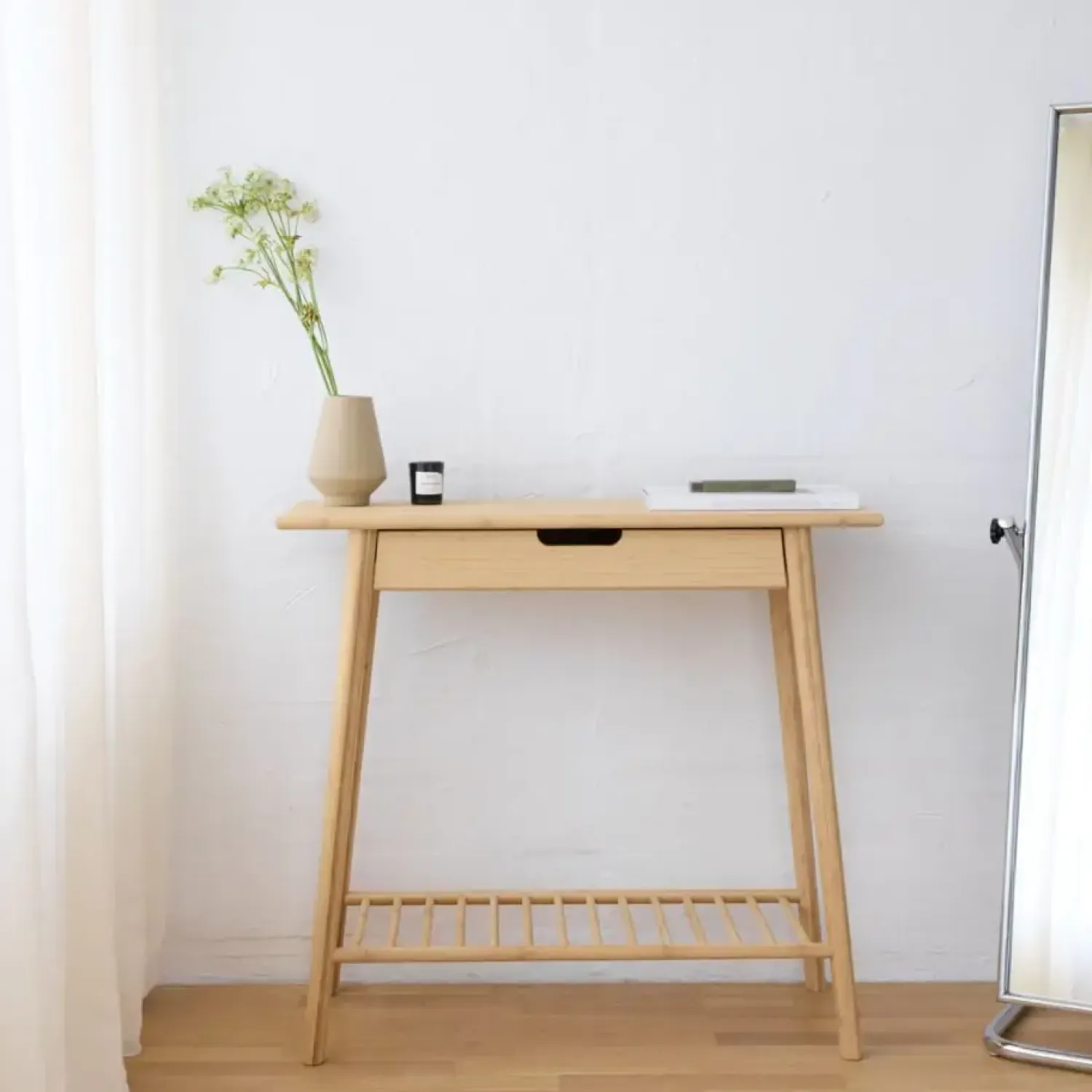 Organiser din entré med Cinas – Noble konsolbord til entré 90x35cm bambus. Dette møbel kombinerer praktisk opbevaring med et moderne design, velegnet til at skabe en organiseret indgang i hjemmet.