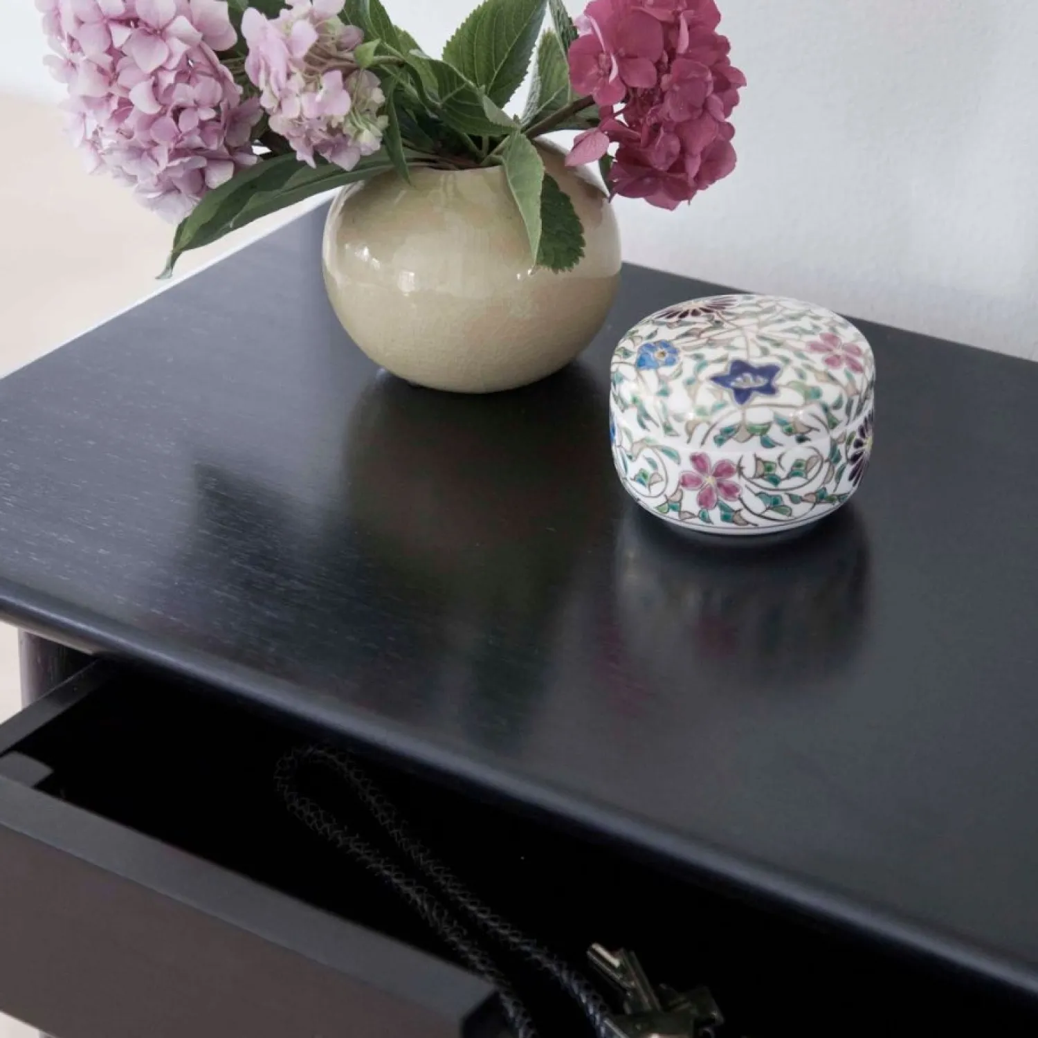 - Bordet har en synlig skuffe under bordpladen.