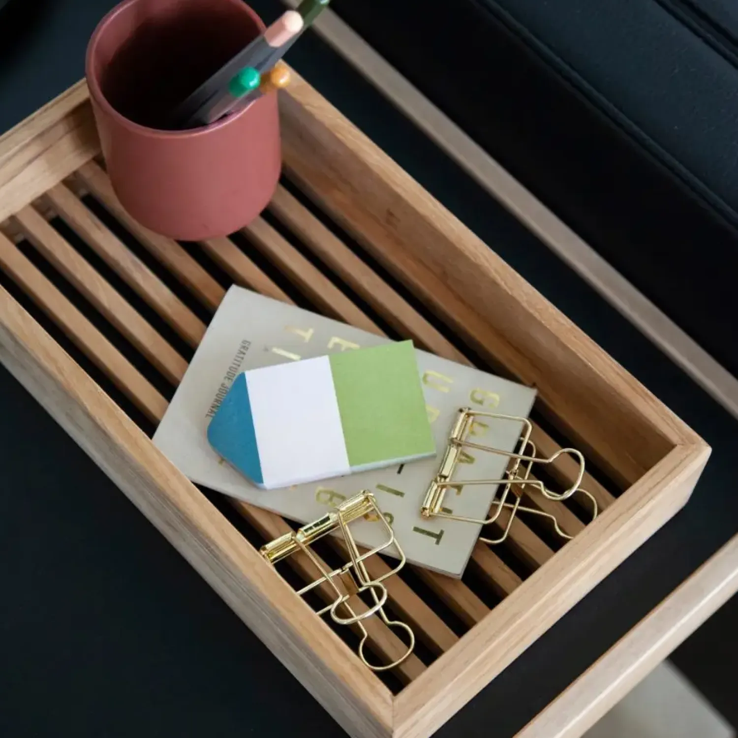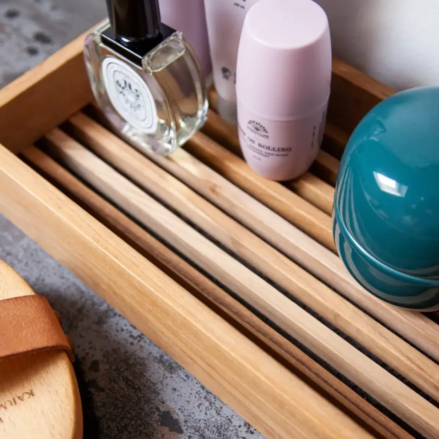 Denne opbevaringsbakke er udformet med fokus på både udseende og funktionalitet. De høje sider hjælper med at holde genstande på plads, mens den slatrede bund giver bakken et særligt præg. Den rektangulære form gør bakken nem at placere på forskellige overflader, og teaktræets naturlige mønstre bidrager til bakkens karakter.