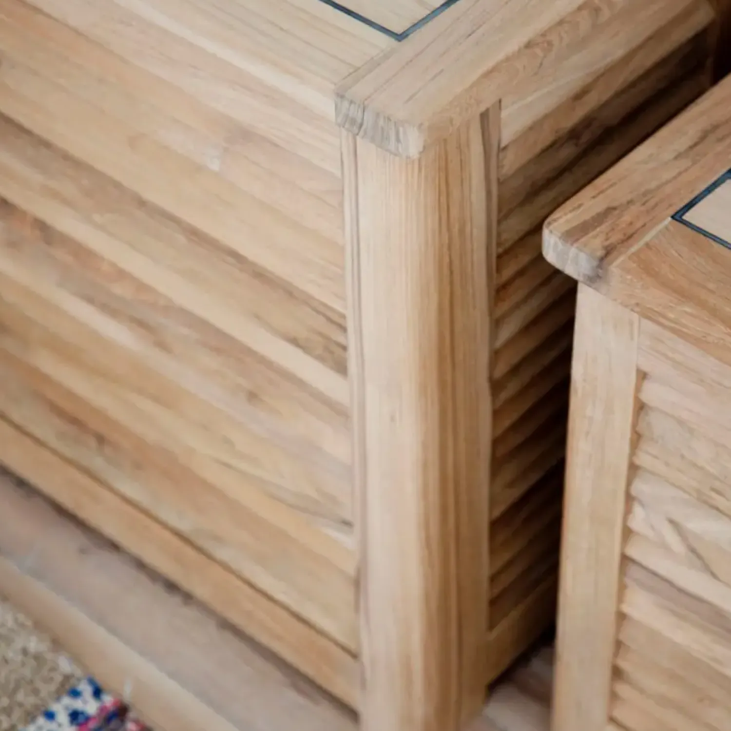 - Opbevaringsboksen er fremstillet af teaktræ med sorte gummiindlæg.