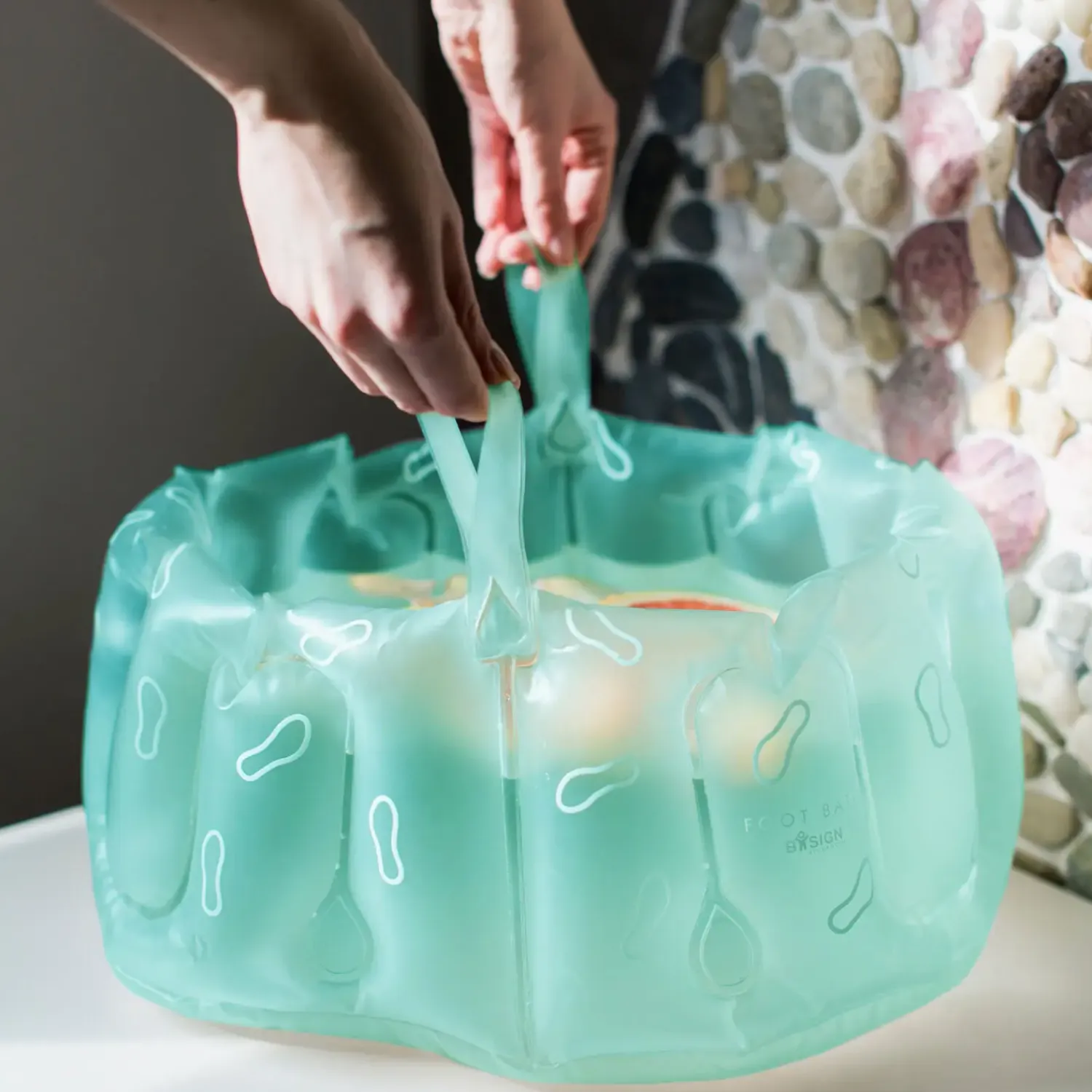 Oppusteligt Fotbad med håndtag – Aqua grøn. 26x38x20 cm. Genanvendt plast (vinyl)
