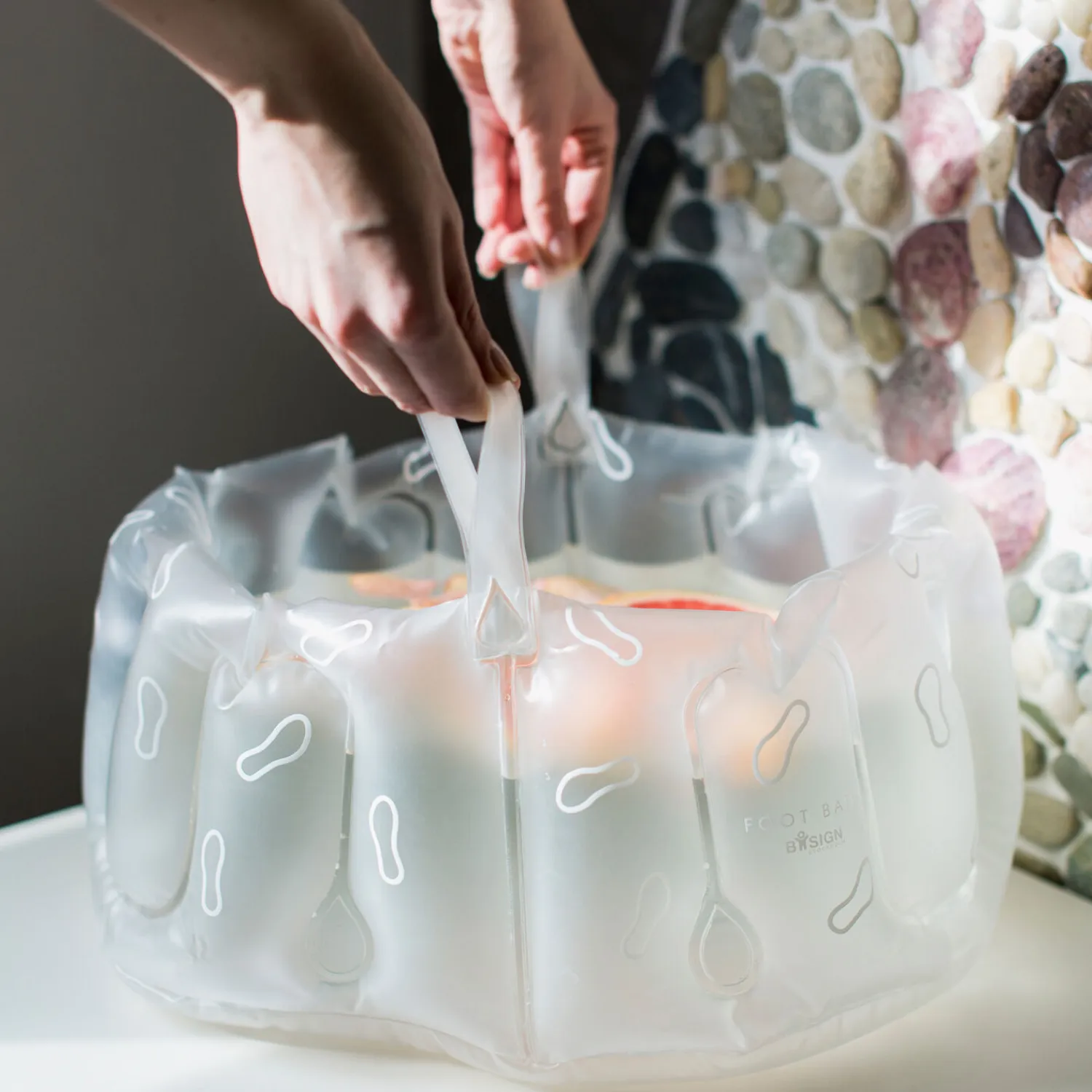 Oppusteligt Fotbad med håndtag – FrostHvid. 26x38x20 cm. Genanvendt plast (vinyl)