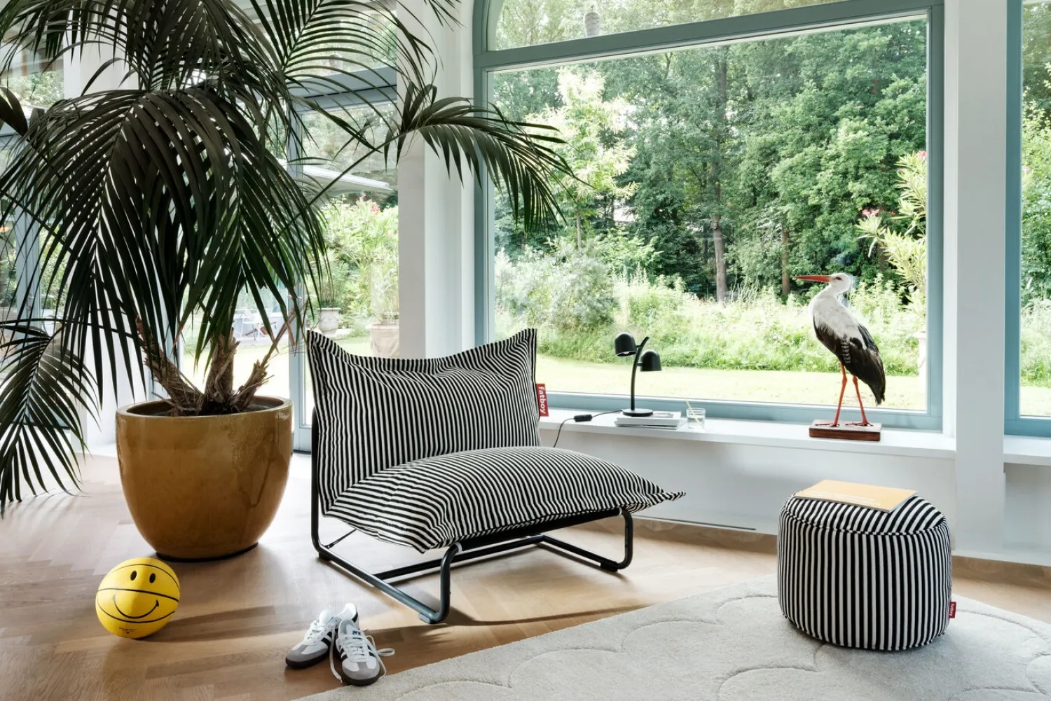 Denne sækkestol fra Fatboy kombinerer komfort med et karakteristisk stribet design i sort og creme. Med sine 155 x 120 cm skaber den en indbydende siddeplads, der nemt kan tilpasses forskellige rum i dit hjem.