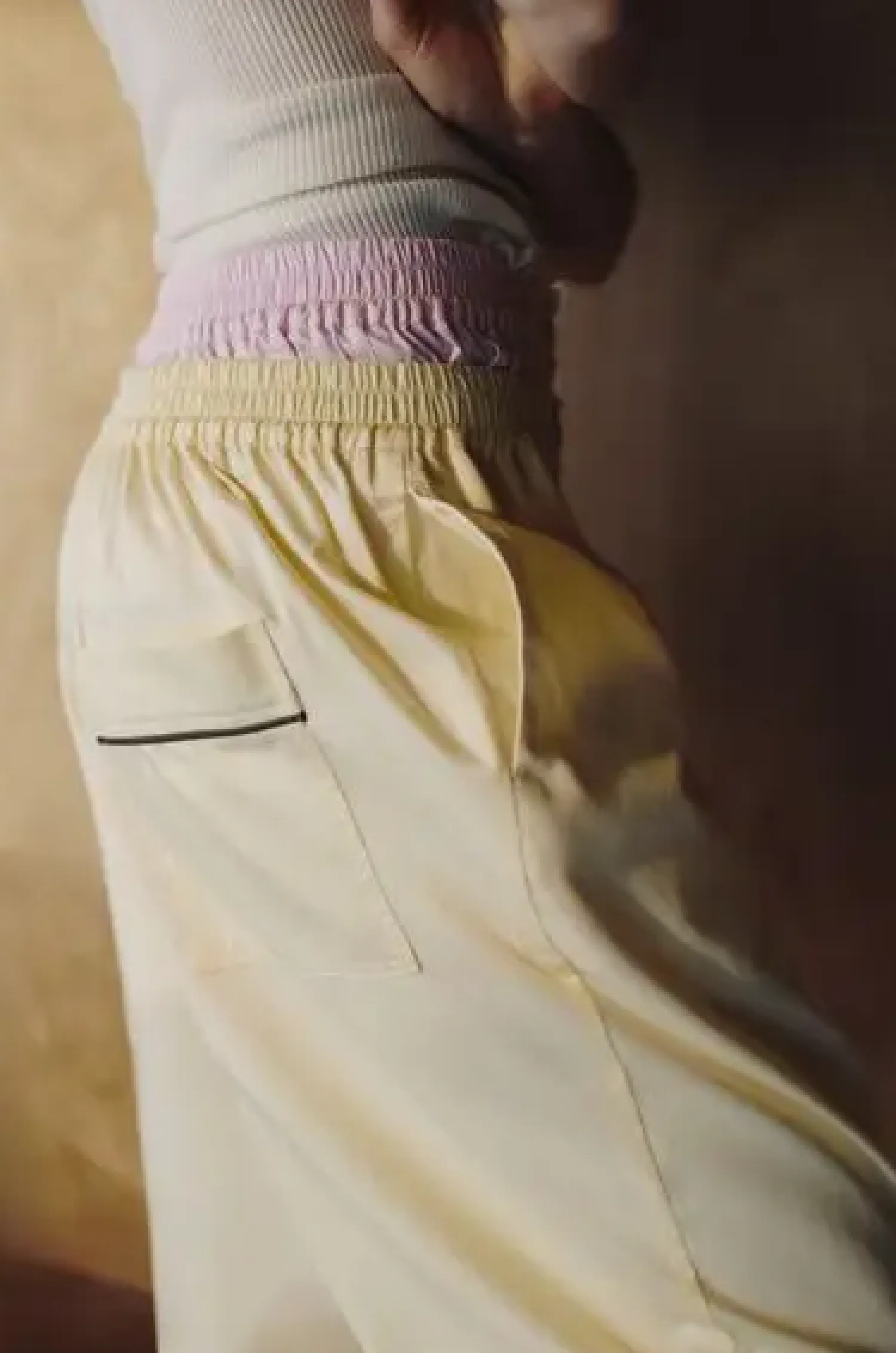 Disse pyjamasbukser fra HAY er fremstillet i 100% bomuld, hvilket giver dig naturlig blødhed og åndbarhed gennem natten. Den bløde gule farve og den afslappede pasform i str. M/L skaber en behagelig base for din nattesøvn.