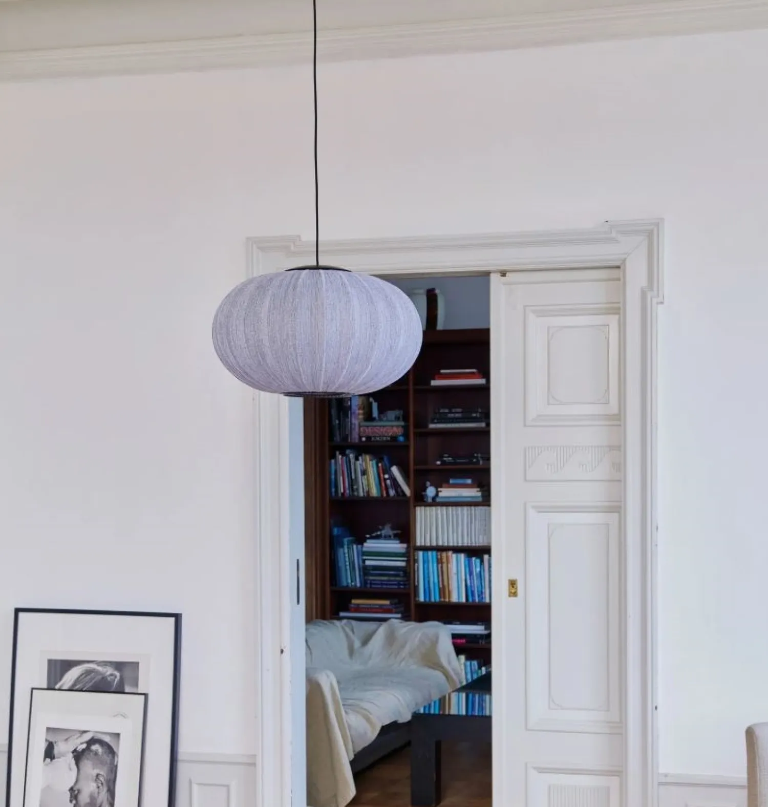 Den ovale pendel kombinerer 3D-strikket konstruktion med en sølvglimmer-effekt. Lampeskærmen er fremstillet af brandhæmmende, genanvendt polyester, der skaber et dynamisk udtryk både med og uden lys.