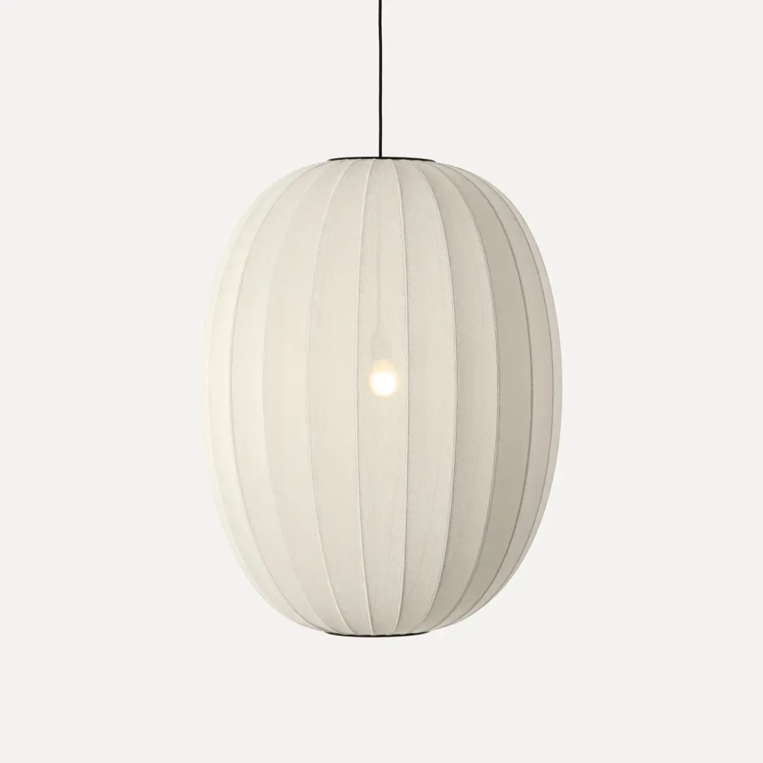 Denne danske pendel kombinerer håndværk med moderne belysning. Den ovale form med lodrette linjer skaber et karakteristisk udtryk, mens den 3D-strikkede overflade fordeler lyset blødt og jævnt gennem materialet.