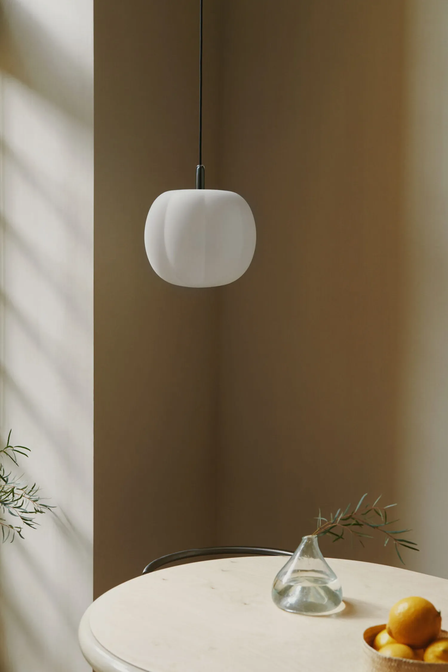 Denne glaslampe er designet af Nina Bruun med inspiration fra græskarrets form. Produktionsprocessen gør hver lampe forskellig med variationer i glasset.
