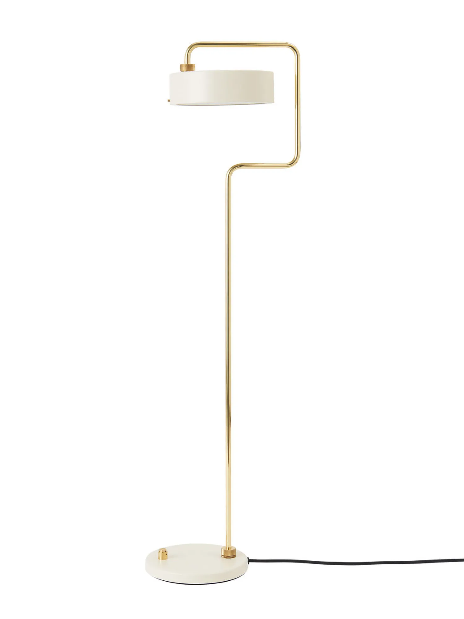 Denne danske gulvlampe kombinerer håndværk med funktionalitet. Konstruktionen i stål og messing giver stabilitet og et rent udtryk i din indretning.
