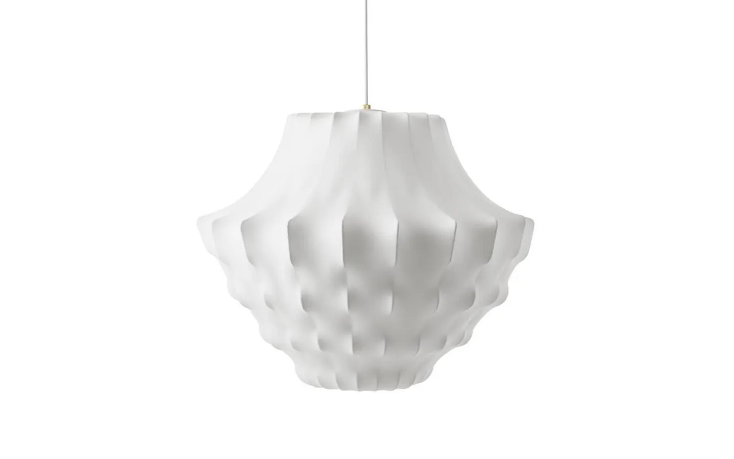 Denne karakteristiske pendel kombinerer et stålskelet med semi-transparent harpiksmateriale. Du får en lampe, hvor harpiksen er omhyggeligt sprøjtet i tætsiddende tråde omkring skelettet, hvilket skaber lampens særprægede, bølgende form.