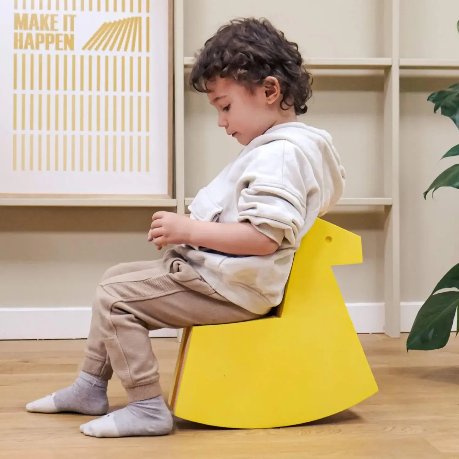 Denne lille hest er en del af bObles x Pippi-kollektionen og bringer leg og bevægelse sammen. Produktet kan bruges som både siddemøbel og klatrehjælp, hvilket gør det til en alsidig ledsager i børneværelset. Det flerfarvede design med gul bund og orange-hvide striber tilføjer et farverigt element.