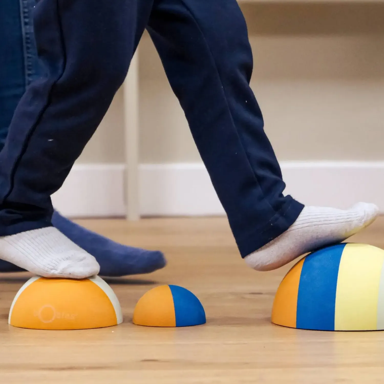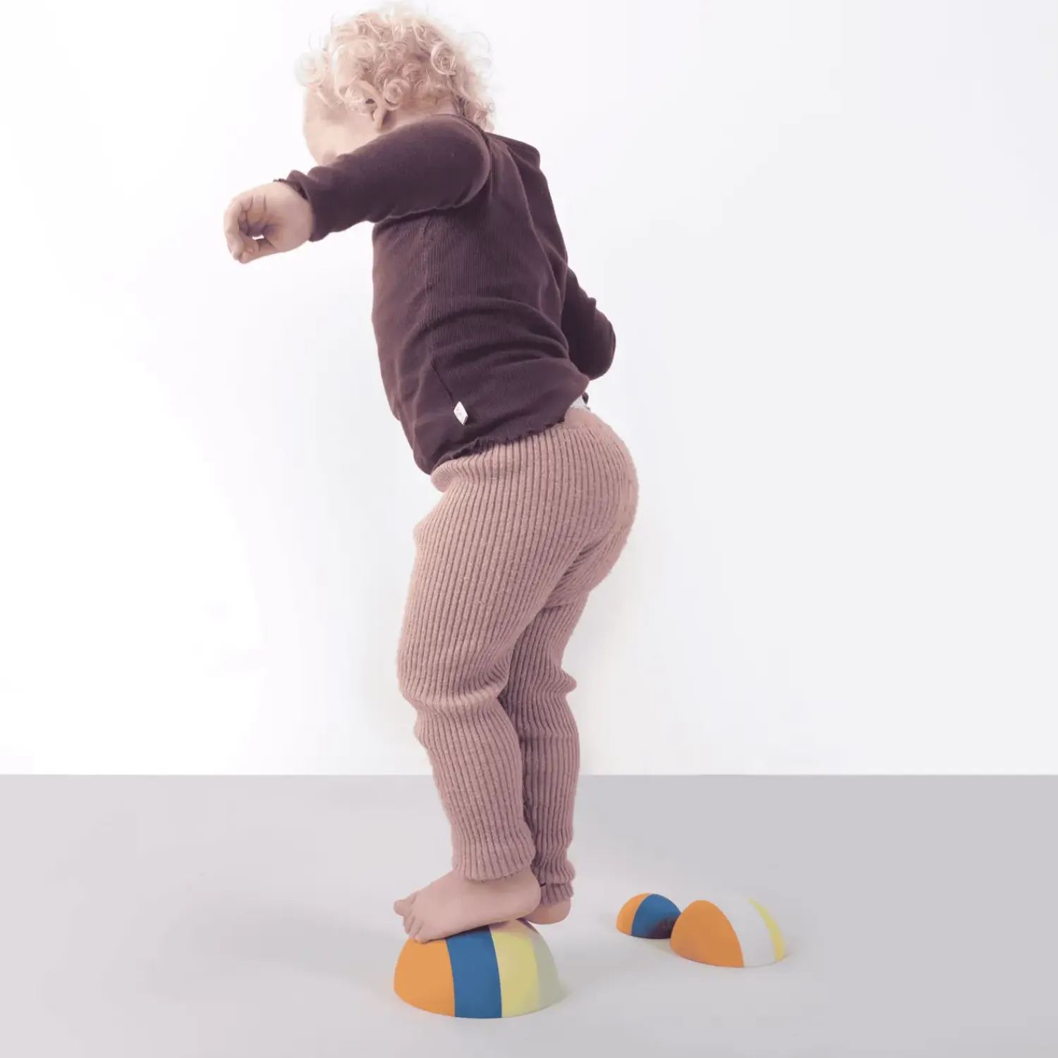 Pippi Tumlesten er skabt til at støtte dit barns motoriske udvikling gennem aktiv leg. De tre halvkugleformede elementer i orange, blå, gul og hvid inviterer til bevægelse, balance og koordinationstræning – alt sammen integreret i daglig leg.