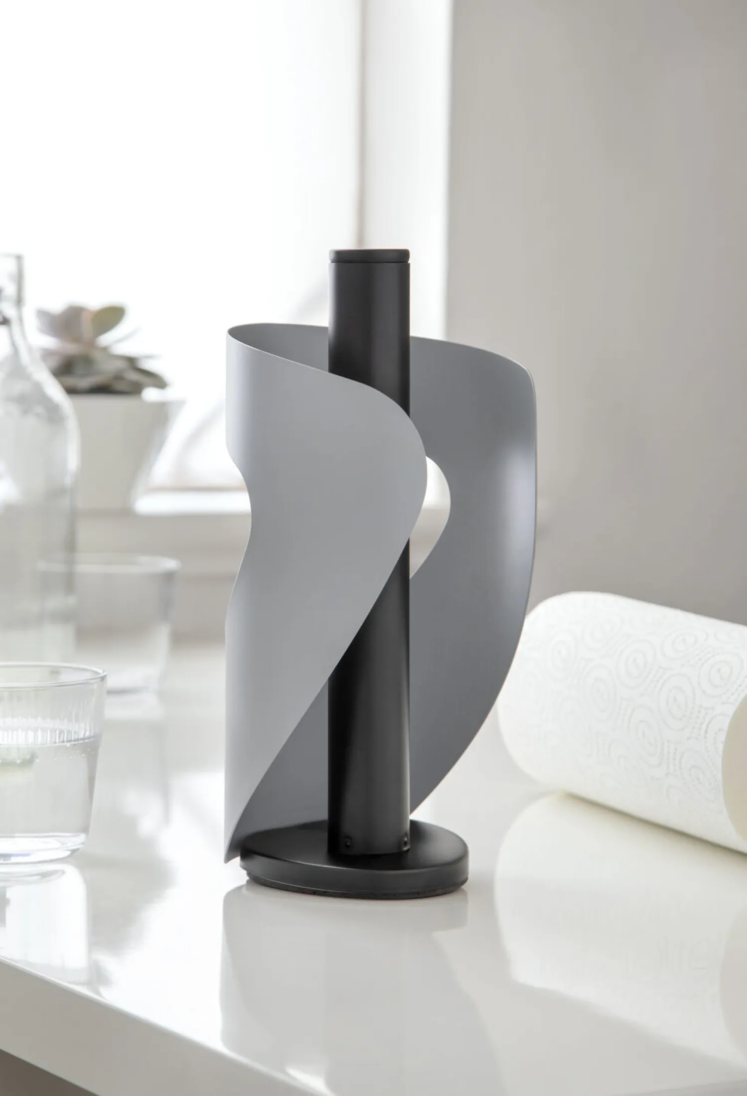 Den spiralformede køkkenrulleholder i grå pulverlakeret metal giver nem adgang fra alle vinkler. Den er designet til placering på køkken- eller spisebordet, hvor den både løser en praktisk opgave og tilfører et interessant element.