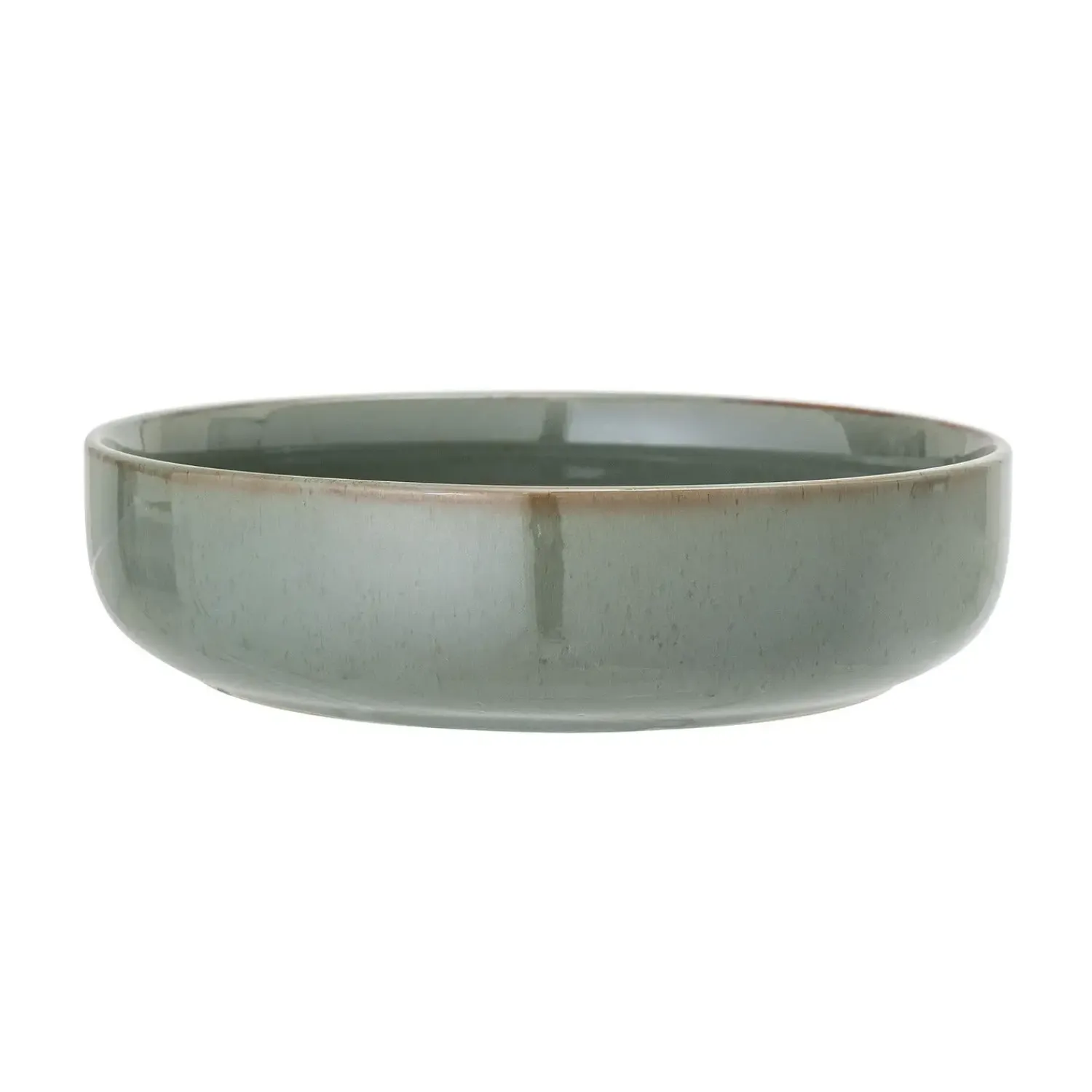 Den afdæmpede grønne farve giver skålen et roligt udtryk, der passer til forskellige borddækninger. Da glasuren er håndlavet, kan der forekomme naturlige farvevariationer, hvilket gør hver skål særpræget. Den glatte overflade har en blank finish.