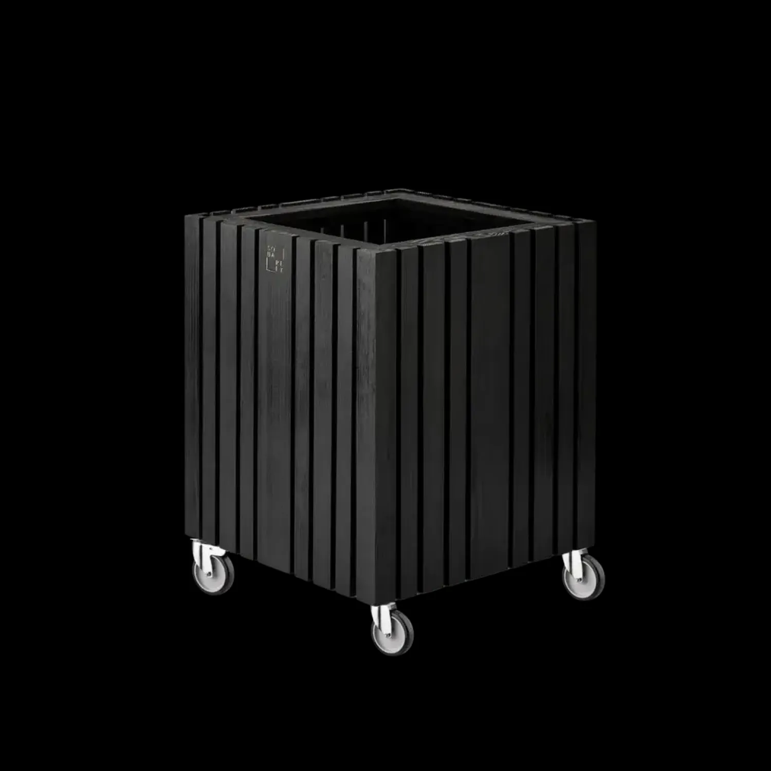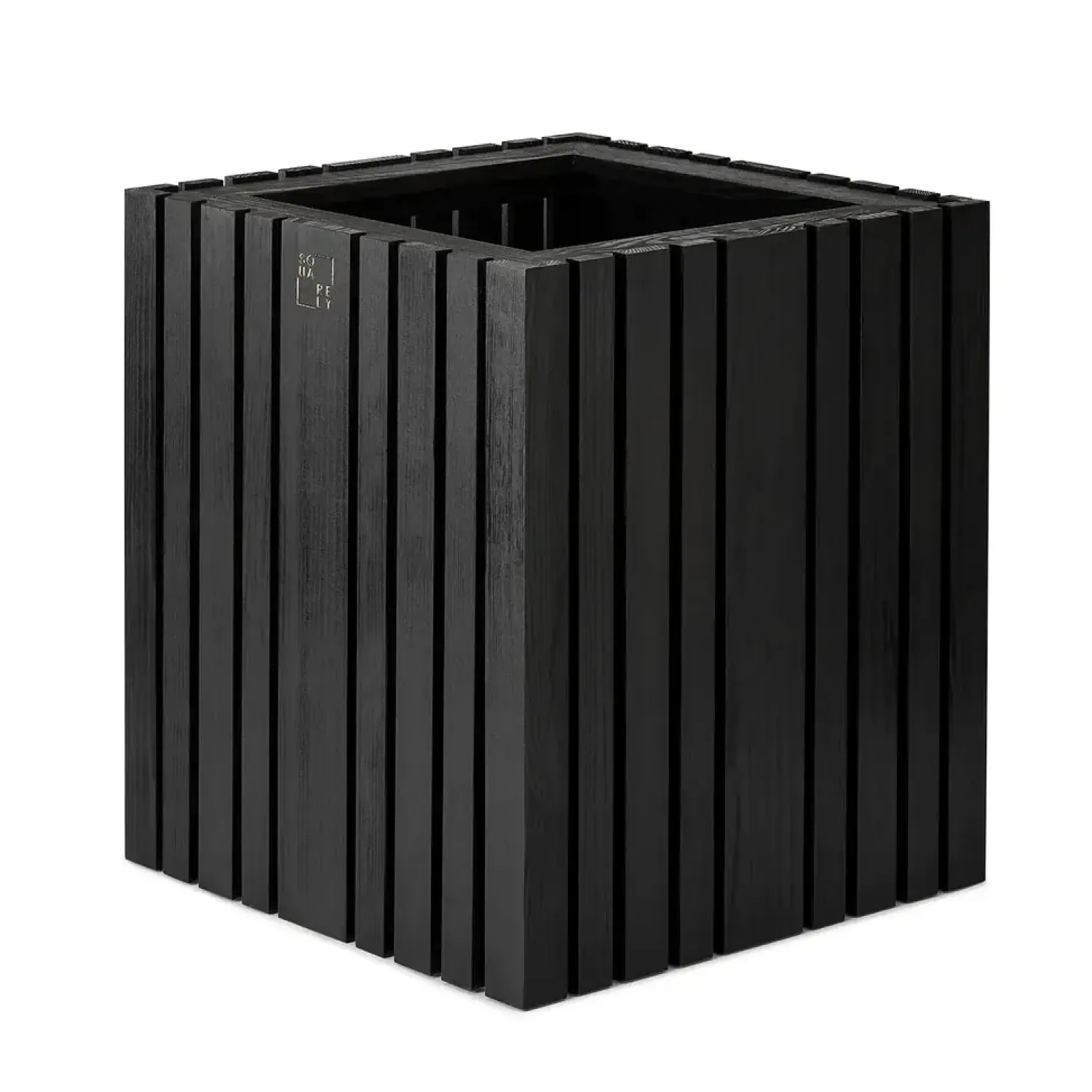 Sort askekasse med ribber til planter. Den rummelige vandbeholder gør vanding nemmere. Kassen passer godt ind i moderne hjem og kontorer. Den giver planterne vand efter behov uden daglig pasning.