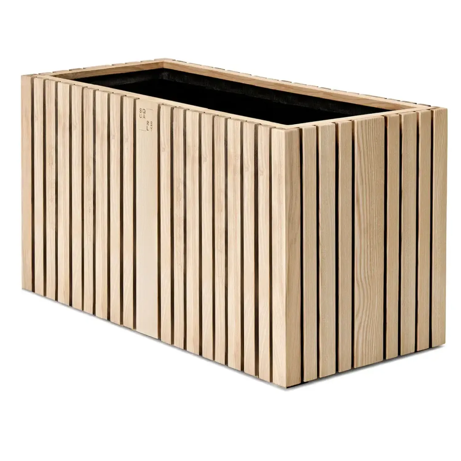 Håndlavet plantekasse i naturlig ask med vertikale lameller og 20L selvvandingssystem. Størrelsen på 90 x 45 x 52 cm gør den praktisk som rumdeler eller grøn væg i kontorer og fællesarealer.