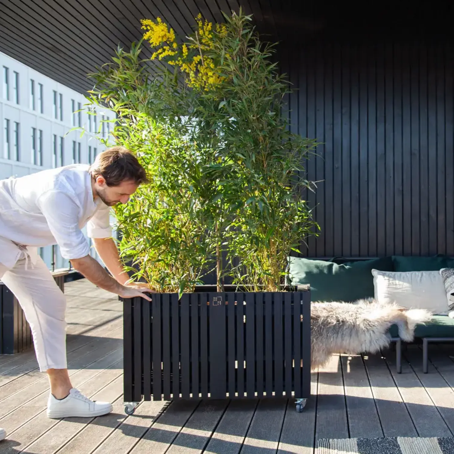 Håndlavet plantekasse i sort ask med trælameller. Den skaber naturlige opdelinger i kontorer. Det indbyggede vandingssystem gør plantepleje nemt og sikrer frodige planter uden daglig pasning.