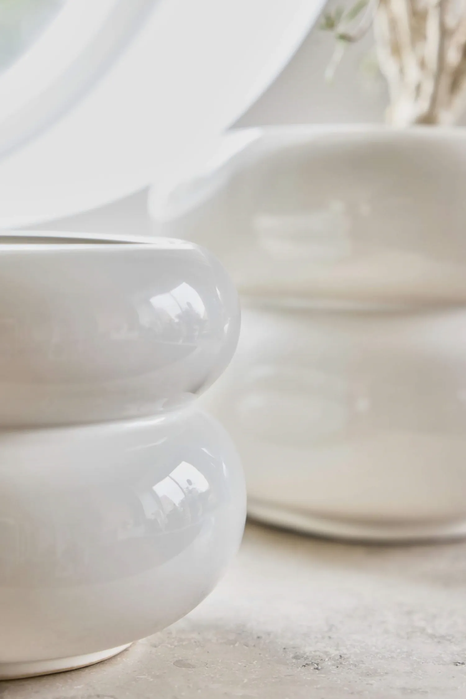 Denne keramiske potte fra OYOY kombinerer et karakteristisk dobbelt-bulb design med praktiske mål på L23 x B23 x H19 cm. Den blanke overflade reflekterer lyset smukt og skaber dybde i rummet.