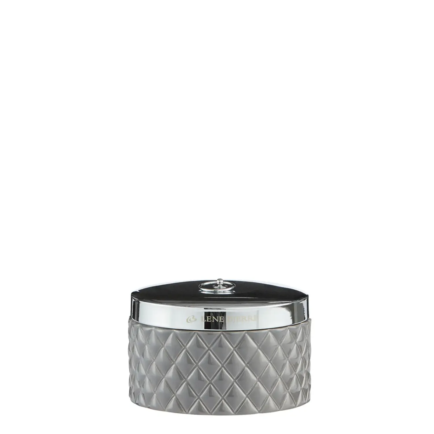 Eksklusiv grå keramik krukke med harlekin design og sølv låg fremstillet af . Denne Portia krukke måler H9xØ15 cm. og er perfekt til opbevaring af småting på badeværelset, hvor den både vil være praktisk og dekorativ på én og samme tid. Brug den eventuelt til smykker, vatpinde, vatrondeller eller til lige hvad du har lyst til.