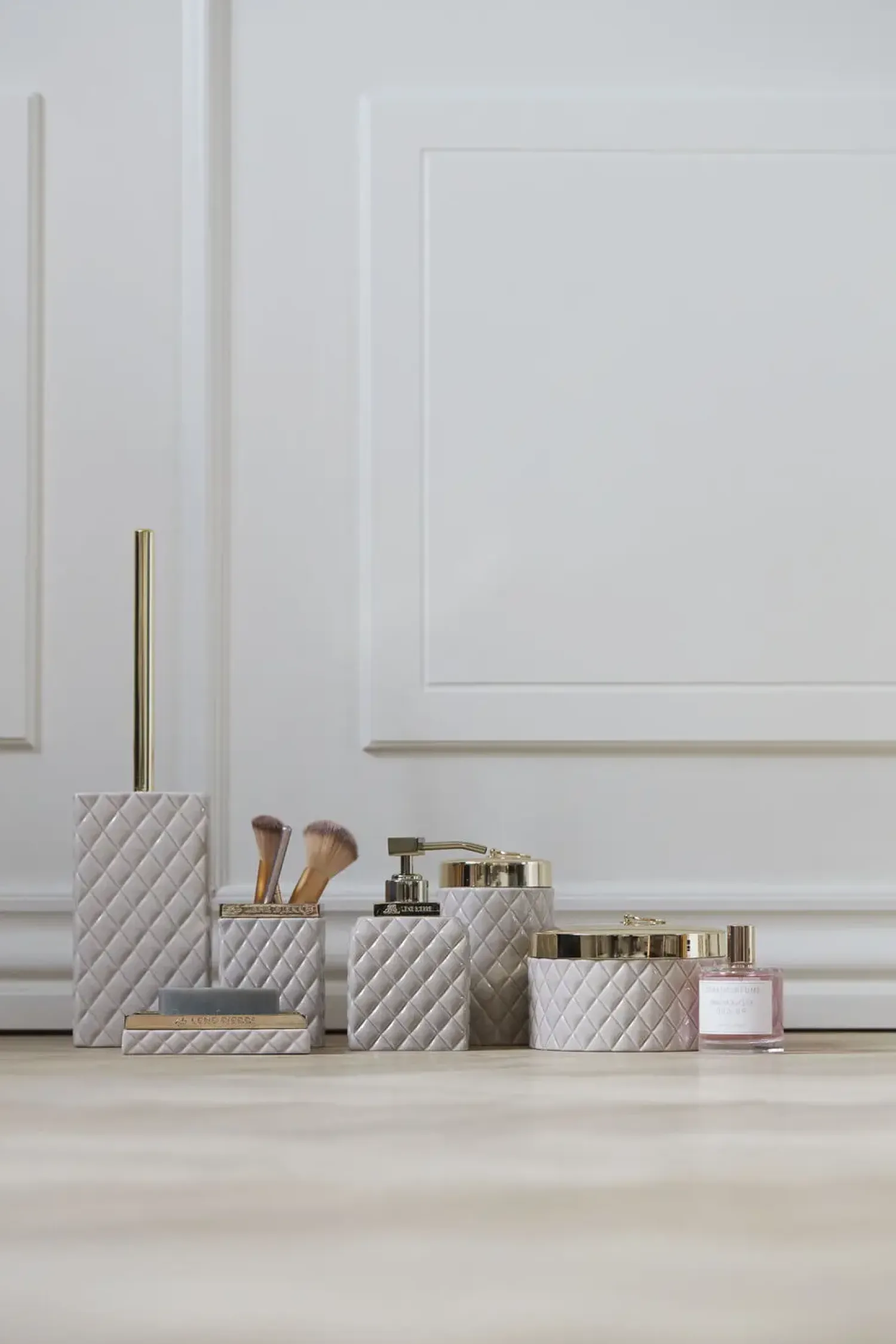 Harlekin mønstret brun keramik tandkrus med sølv top. Dette Portia tandkrus måler L8xB6xH11 cm. og er perfekt til opbevaring på badeværelset, hvor det vil være både praktisk og dekorativ på én og samme tid. Brug det til tandbørster eller måske til make-up pensler, hårbørster eller noget helt tredje. Hos Lene Bjerre har vi skabt et bredt sortiment af flotte tandkrus, hvor funktionalitet og design er i fokus. Du kan vælge imellem forskellige materialer, farver og designs og dermed nemt og enkelt bringe et nyt udtryk på dit badeværelse.