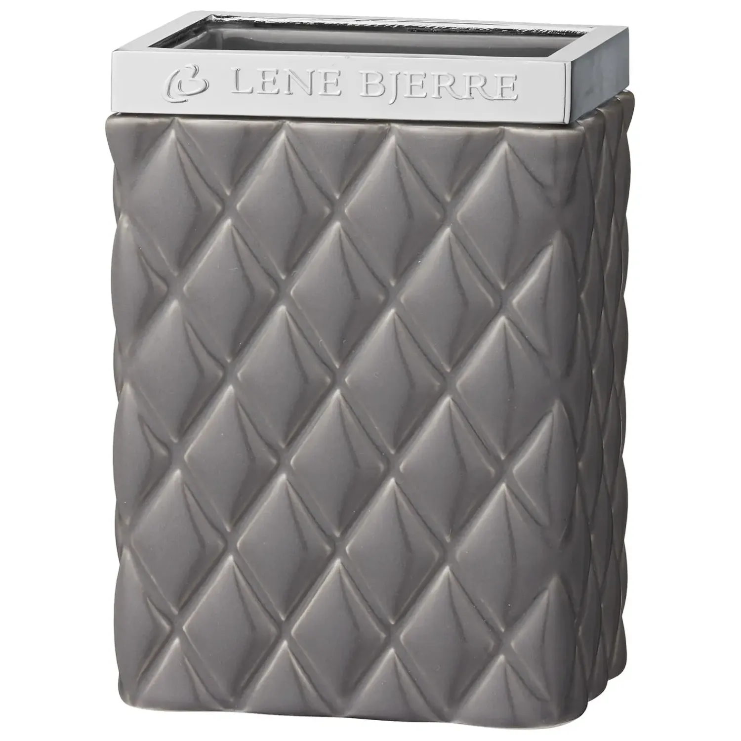 Harlekin mønstret grå keramik tandkrus med sølv top. Dette Portia tandkrus måler L8xB6xH11 cm. og er perfekt til opbevaring på badeværelset, hvor det vil være både praktisk og dekorativ på én og samme tid. Brug det til tandbørster eller måske til make-up pensler, hårbørster eller noget helt tredje. Hos Lene Bjerre har vi skabt et bredt sortiment af flotte tandkrus, hvor funktionalitet og design er i fokus. Du kan vælge imellem forskellige materialer, farver og designs og dermed nemt og enkelt bringe et nyt udtryk på dit badeværelse.
