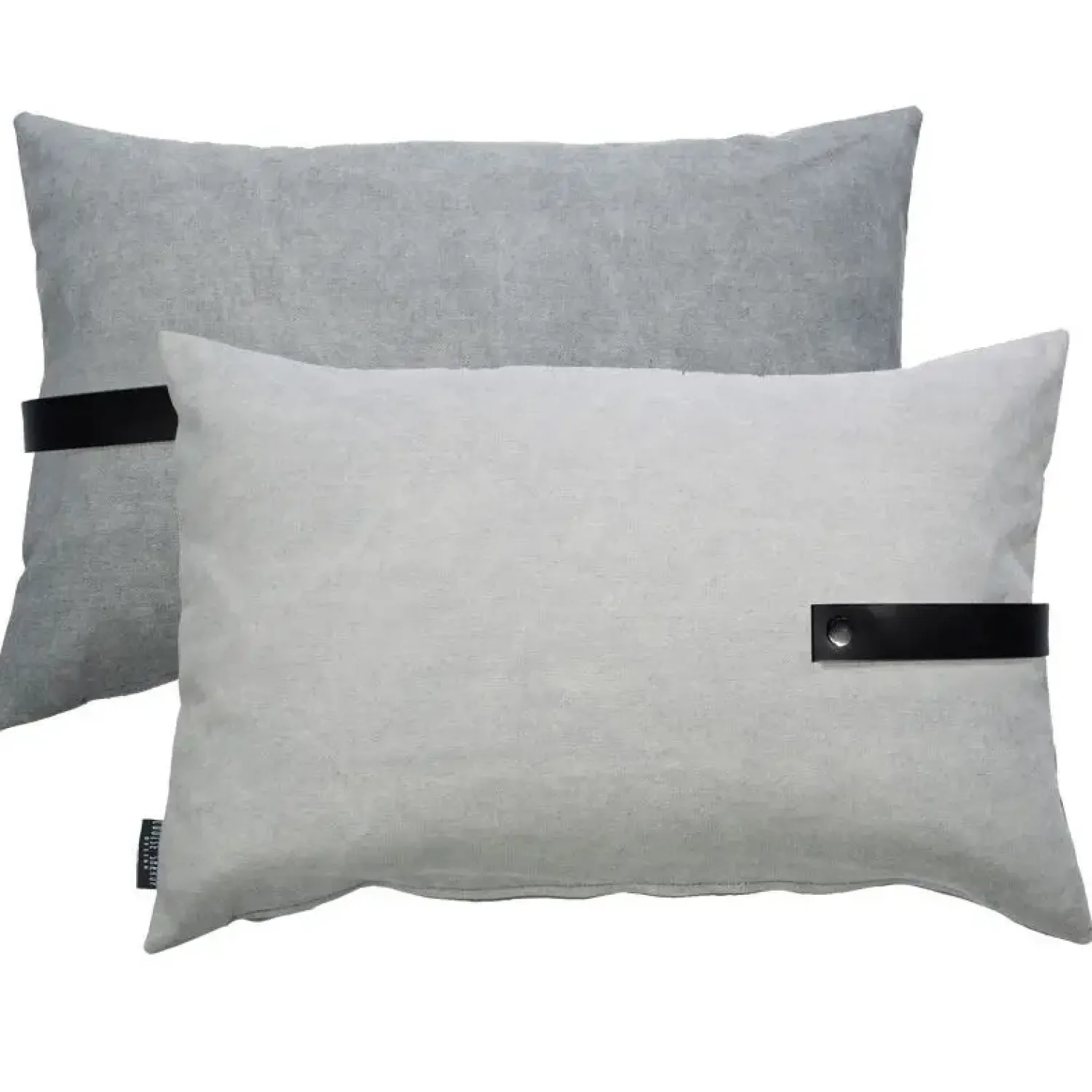 Denne pude er designet med 2 forskellige farver stof. På den ene side er der en lys grå, og på den anden side er der en mørkere grå farve.