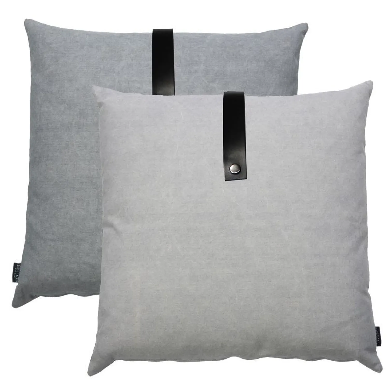 Denne pude er designet med 2 forskellige farver stof. På den ene side er der en lys grå, og på den anden side er der en mørkere grå farve.