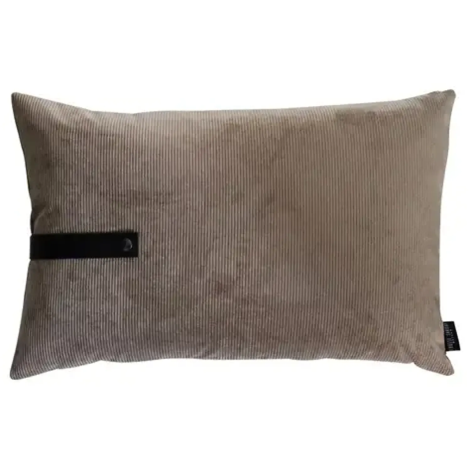 Super fin pude fra Louise Smærup, der er syet af fløjlstekstil i høj kvalitet, som giver et simpelt og lækkert udtryk, og samtidig muligheden for at matche og style puden, som du ønsker. Puden er i en skøn sandfarve og er påført en læderrem i sort kernelæder, der giver puden en super fin detalje.