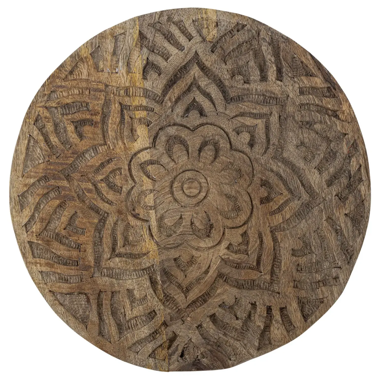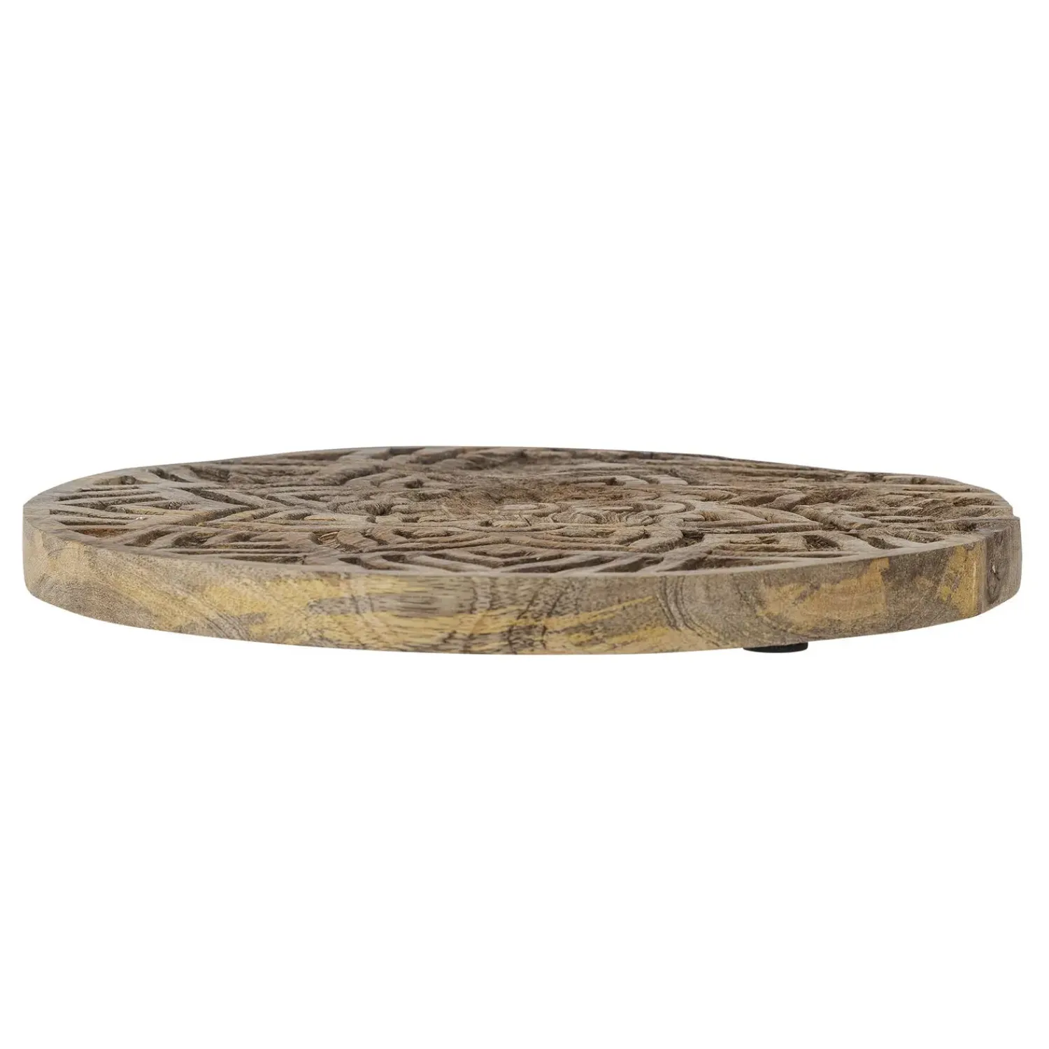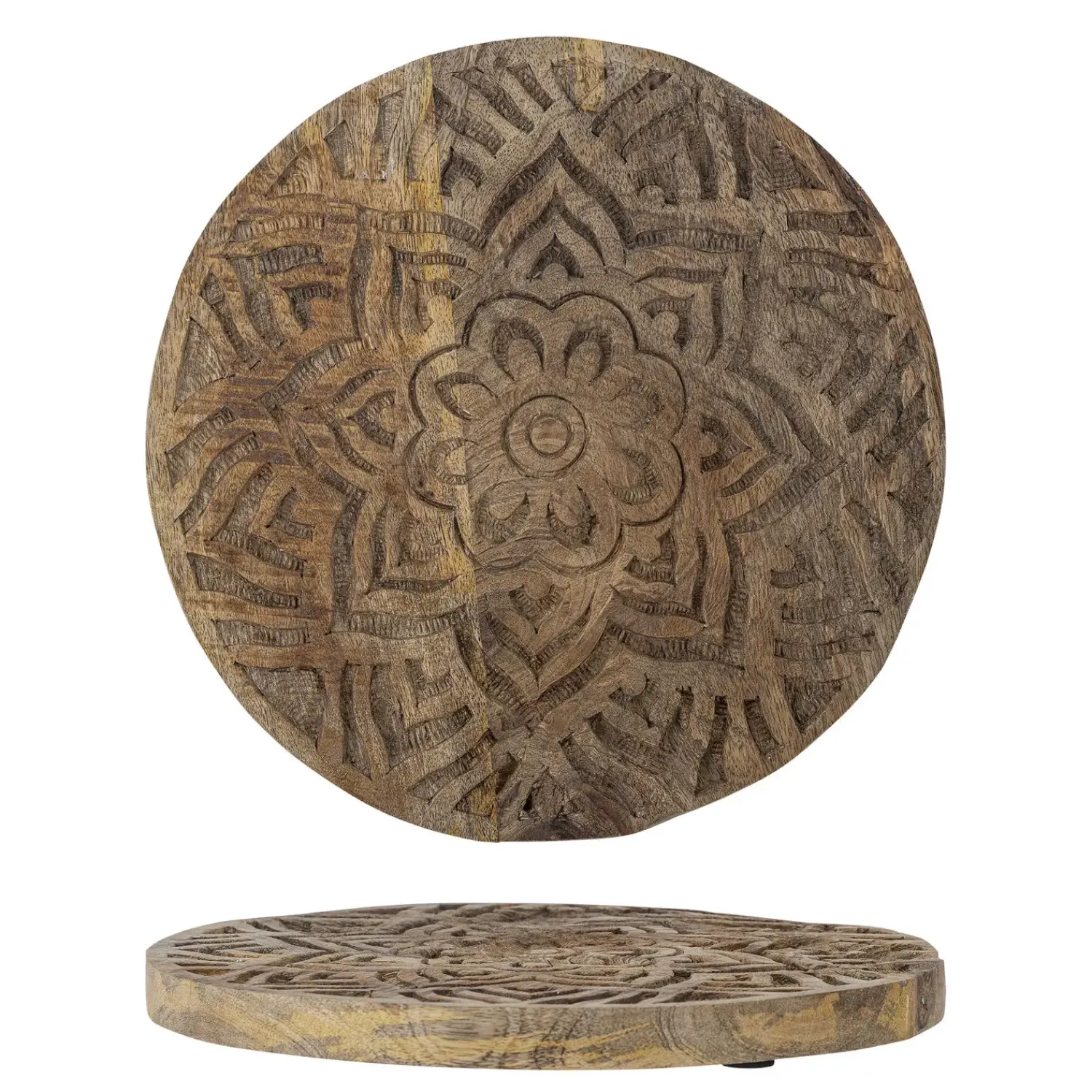 Dette håndlavede serveringsfad i mangotræ bringer naturlig varme til din bordopdækning. Den runde form med udskåret mønster skaber en særlig stemning, når du serverer for familie og gæster.