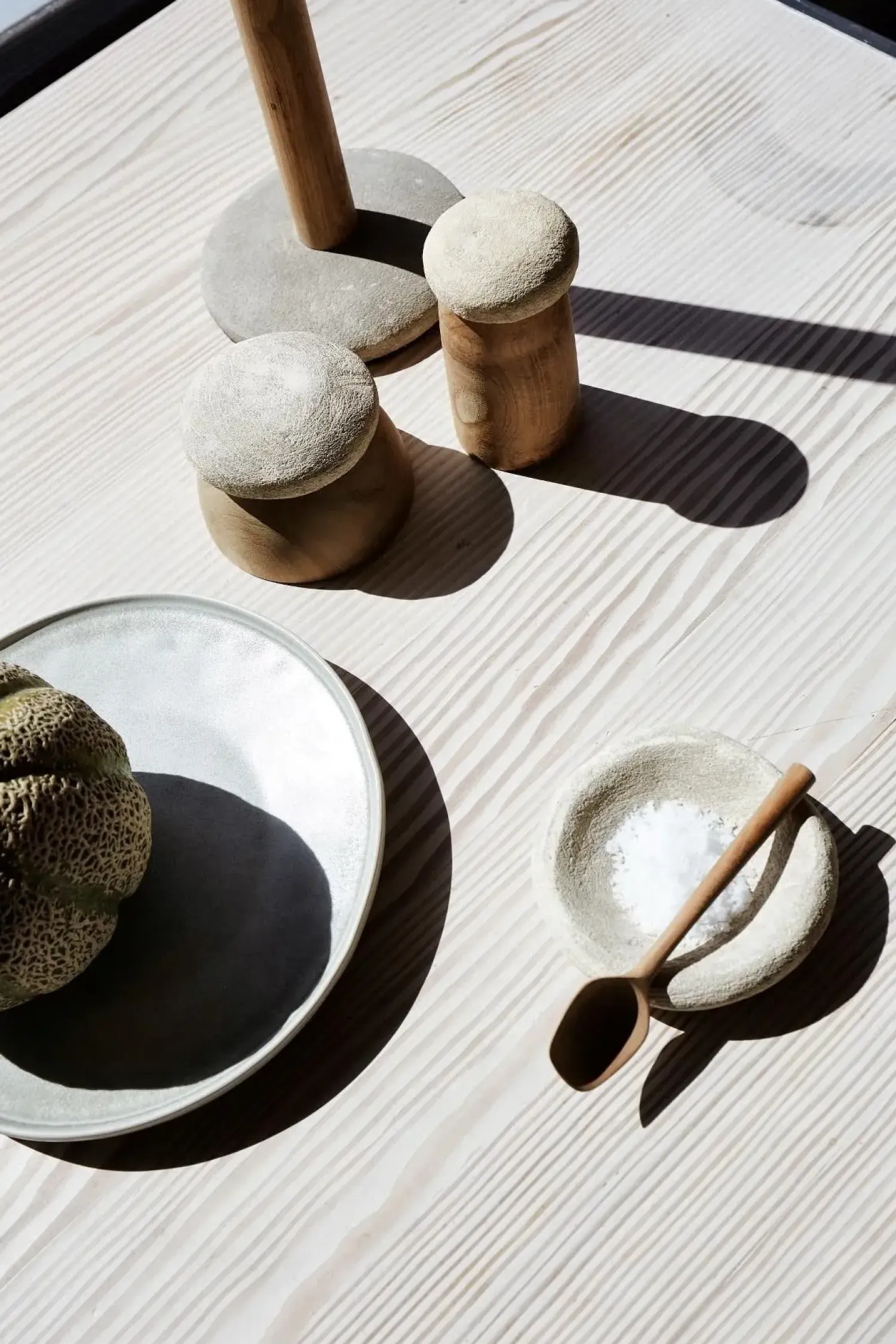 Ray køkkenrulleholderen er kendetegnet ved sin gennemtænkte konstruktion. Kombinationen af sandsten og teak giver holderen en solid base og et naturligt udseende. Den polstrede bund er specifikt designet til at beskytte overflader mod ridser, hvilket gør den velegnet til både køkkenborde og spiseborde. Holderens proportioner er nøje overvejet for at passe ind i forskellige køkkenmiljøer.