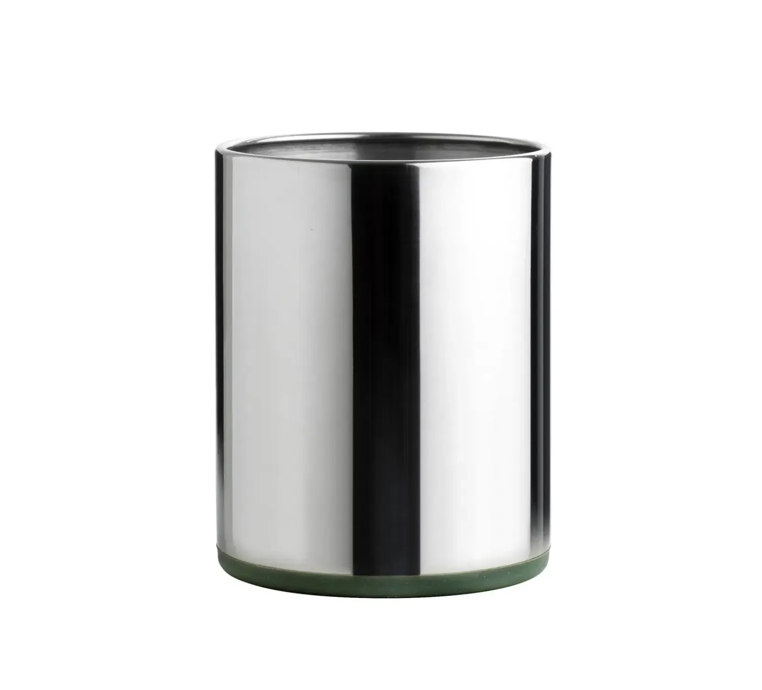 Denne redskabsholder i poleret rustfrit stål giver dig en praktisk løsning til dine køkkenredskaber. Den cylindriske form kombinerer holdbarhed med et rengøringsvenligt design, mens den grønne silikonebund beskytter dine overflader.