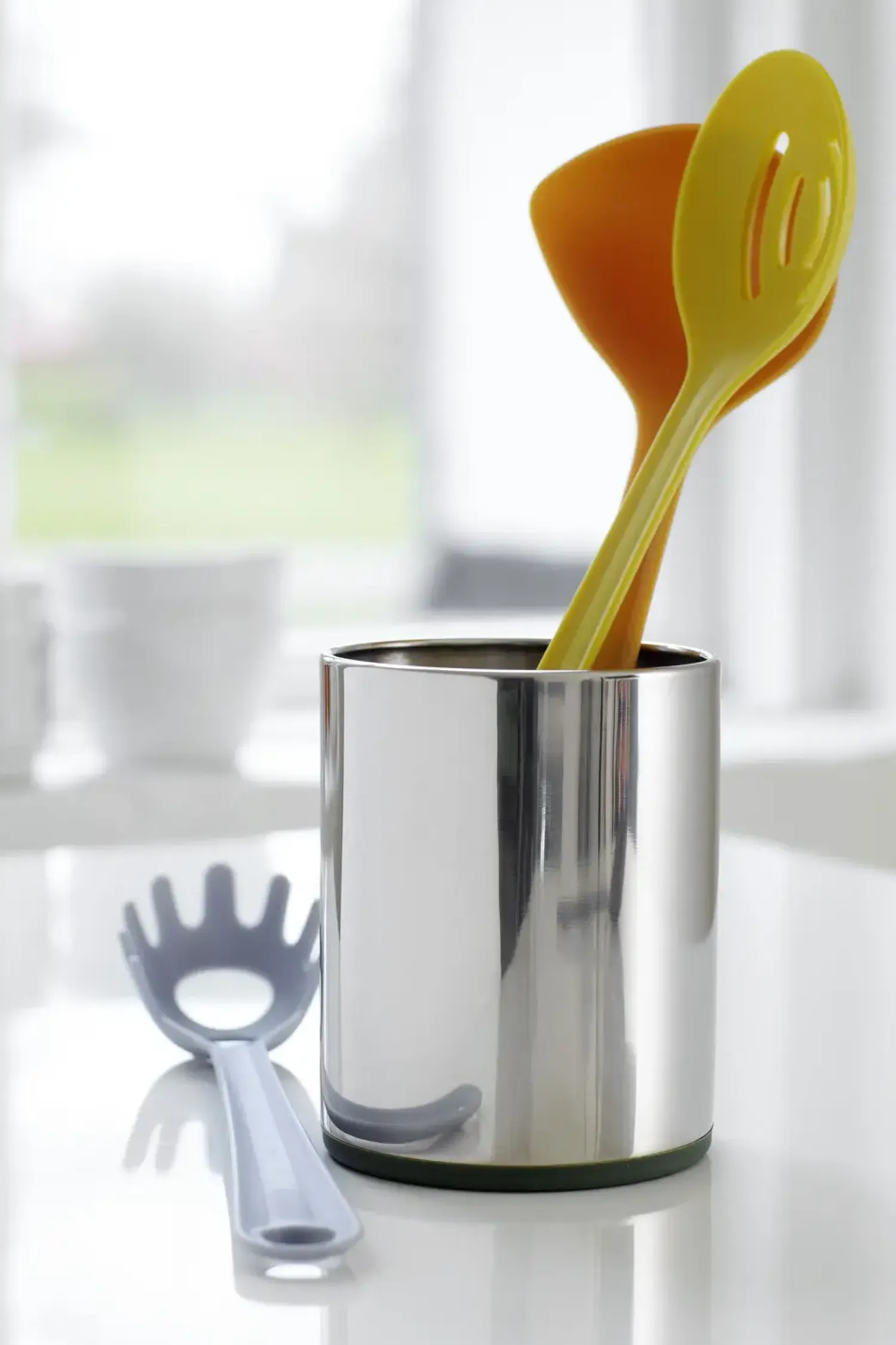 Silikonebunden sikrer, at holderen står stabilt på køkkenbordet uden at glide eller ridse underlaget. Den cylindriske form giver god plads til dine køkkenredskaber, så du altid har dem inden for rækkevidde, når du laver mad.